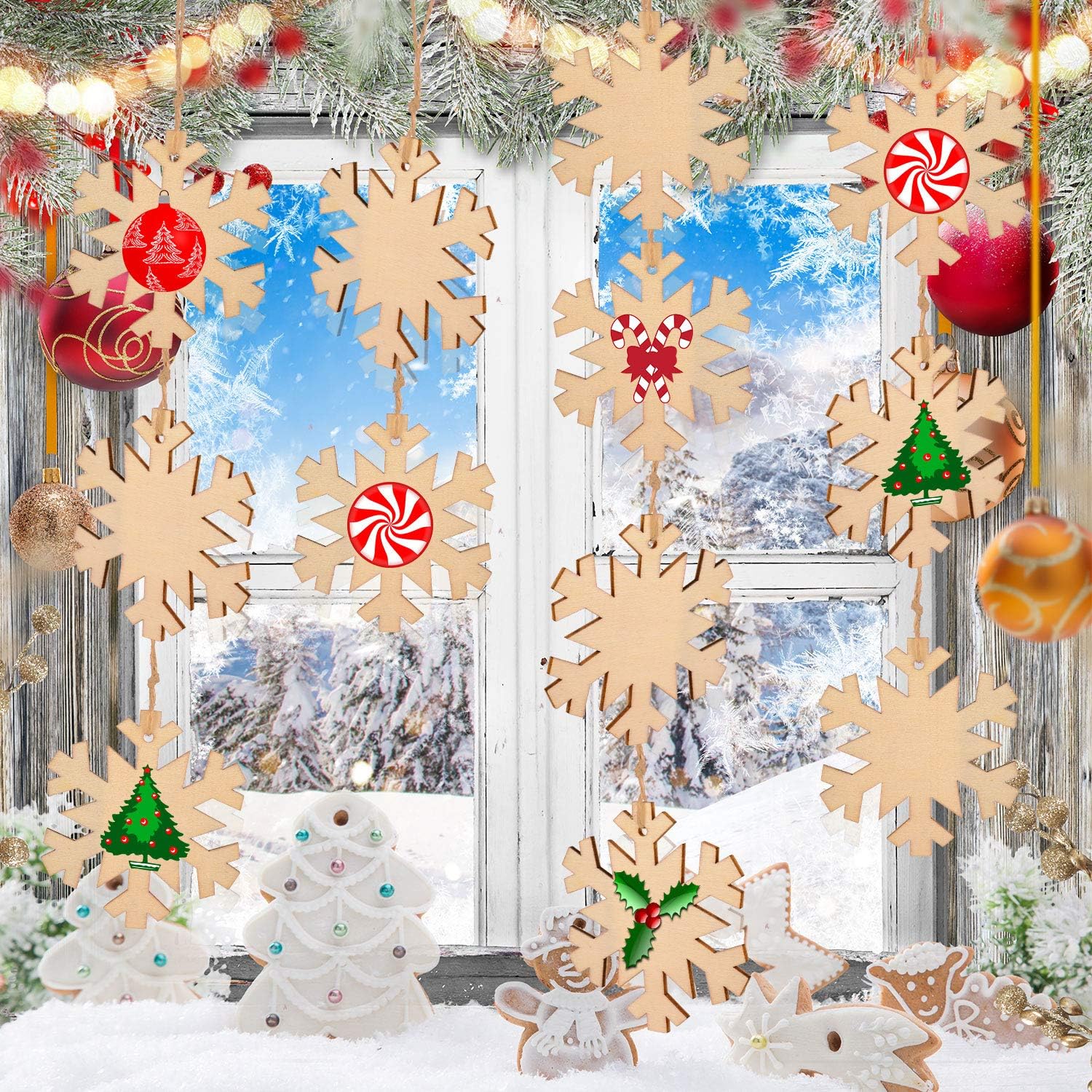 Blulu 60 Pieces Christmas Wooden Ornaments Round Wood Slices Snowflake Angel Shape with Cords for DIY Crafts New Year Christmas Tree Pendant Ornaments