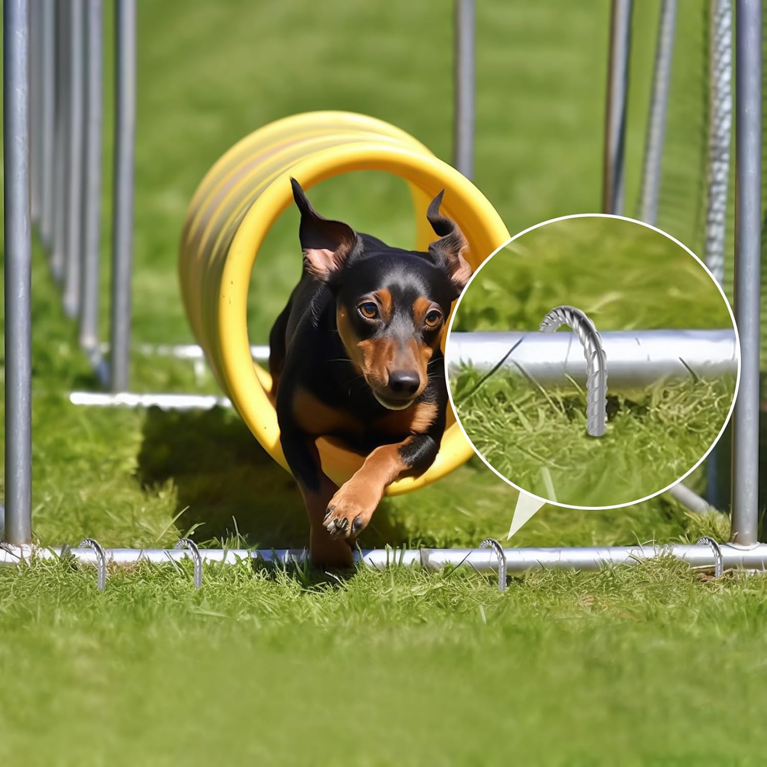 - GALVANIZED STEEL FENCE STAKES - Galvanized steel rebar finish, years to use.These garden staples are anti-rust. They're applied Premium Hot-Dip Galvanizing with thicker coating for chain link fences, deer fence, inflatable outdoor yard decorations, irrigation, tents, tarps, rodent fences, soccer nets, landscape edging, swing sets, sports training equipment, garden trellises, gazebos and more