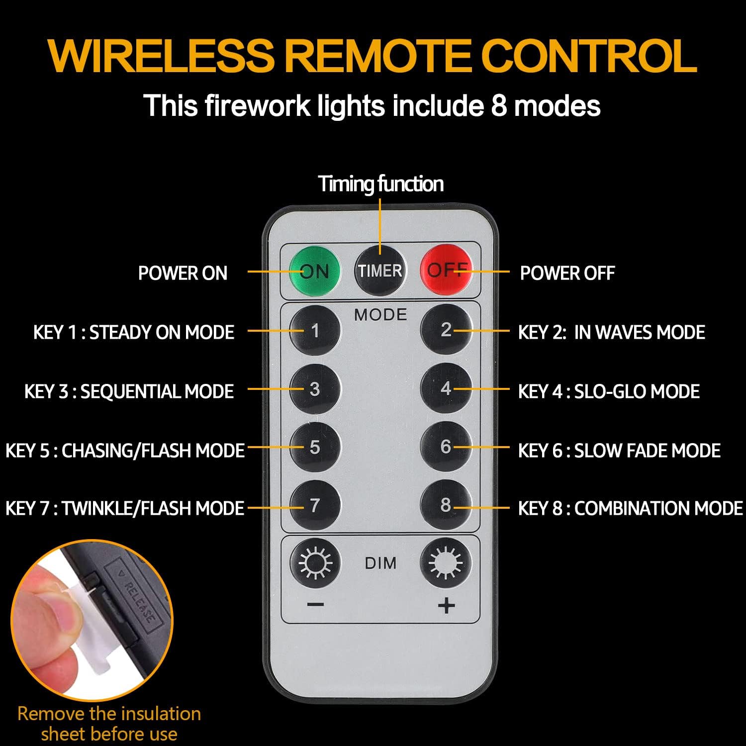 8 Pack Firework Lights 180 Led Copper Wire with 8 Models Power Supply Remote Control Waterproof Outdoor Hanging for Decor Garden Party Christmas