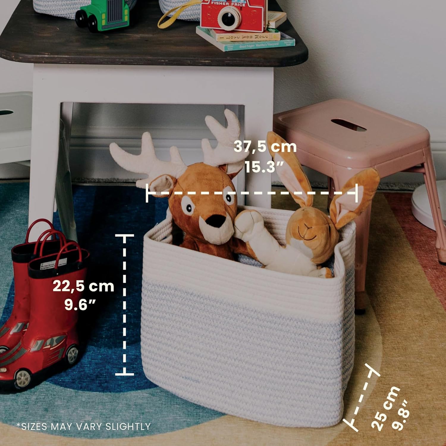 - All-Purpose Cube Storage Baskets – These 15” x 10” x 9” rope storage baskets are ideal for keeping your everyday home life more organized and provide plenty of compact storage space for arts and crafts, classroom decor, kid’s toys, or nursery storage and room accessories