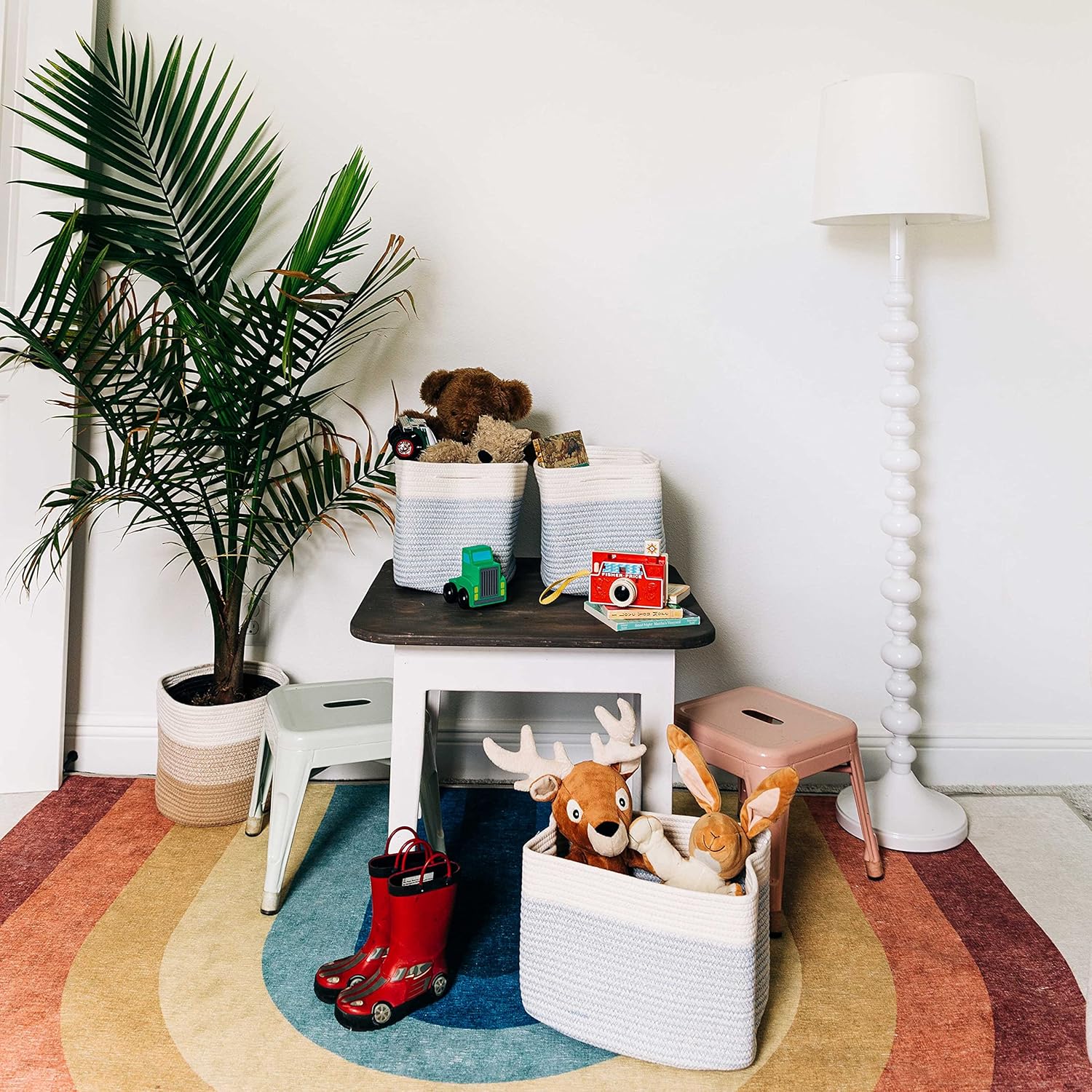 - Vintage Colors to Match Every Style – Charming and stylish these versatile storage organizer bins come in 7 exclusive colors to match your home closet or style including 3-tone gray, blue / off-white, rainbow / off-white, pink / off-white, brown / off-white, gray / black, gray / honey, gray / off-white, honey / off-white, light honey / off-white, black, white and rainbow.