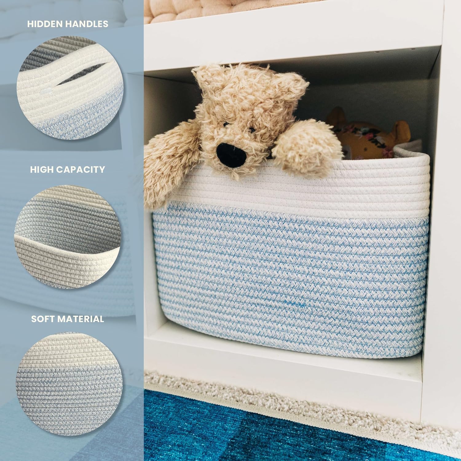 - Discrete, Built-In Carry Handles – These fabric rope baskets for storage also feature slim hand holds built right into the sides of each round basket for a seamless look that’s also functional. Perfect for picking up toys or carrying items around the house.