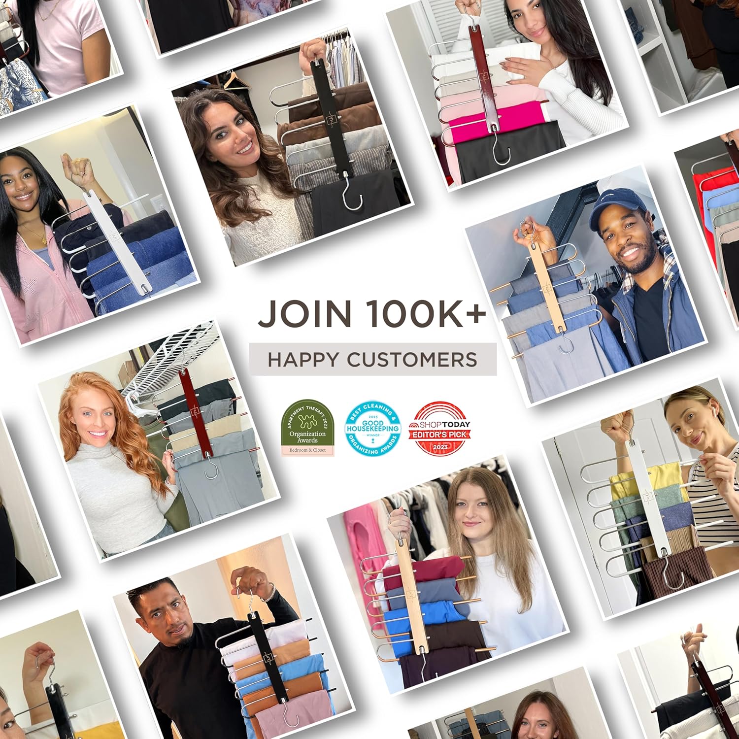 - MULTIUSE SPACE SAVING ORGANIZATION - Our clothes hangers space saving wardrobe organizer goes beyond pants hangers for men and women. Our multi hanger sets are slack hangers, a jeans organizer for closets, skirt organizer hangers, trouser hangers, scarf organizers and more giving a complete multifunctional pants rack.