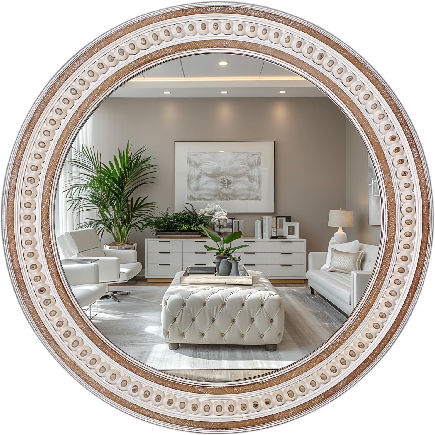 - Chic Rustic Charm for Any Space: Enhance your home with the 24'' Round Mirror, a perfect blend of rustic and boho design. Crafted with a wooden frame, this circle mirror brings a warm, natural texture to any room. Whether you're adding a touch of elegance to your bathroom, creating a focal point in your entryway, or complementing the decor in your bedroom or living room, this mirror is a versatile accent piece that enhances any space.
