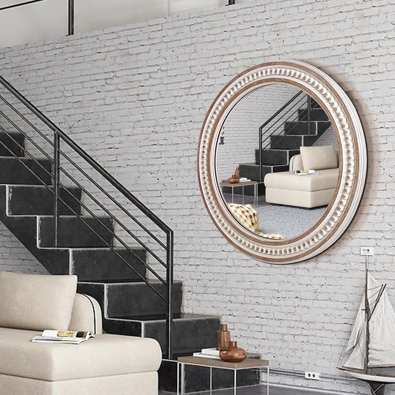 24 Inches Rustic Round Wall Mirrors - Wooden Farmhouse Circle Mirror for Bathroom, Entryway, Bedroom, Living Room, Entryway Decorative