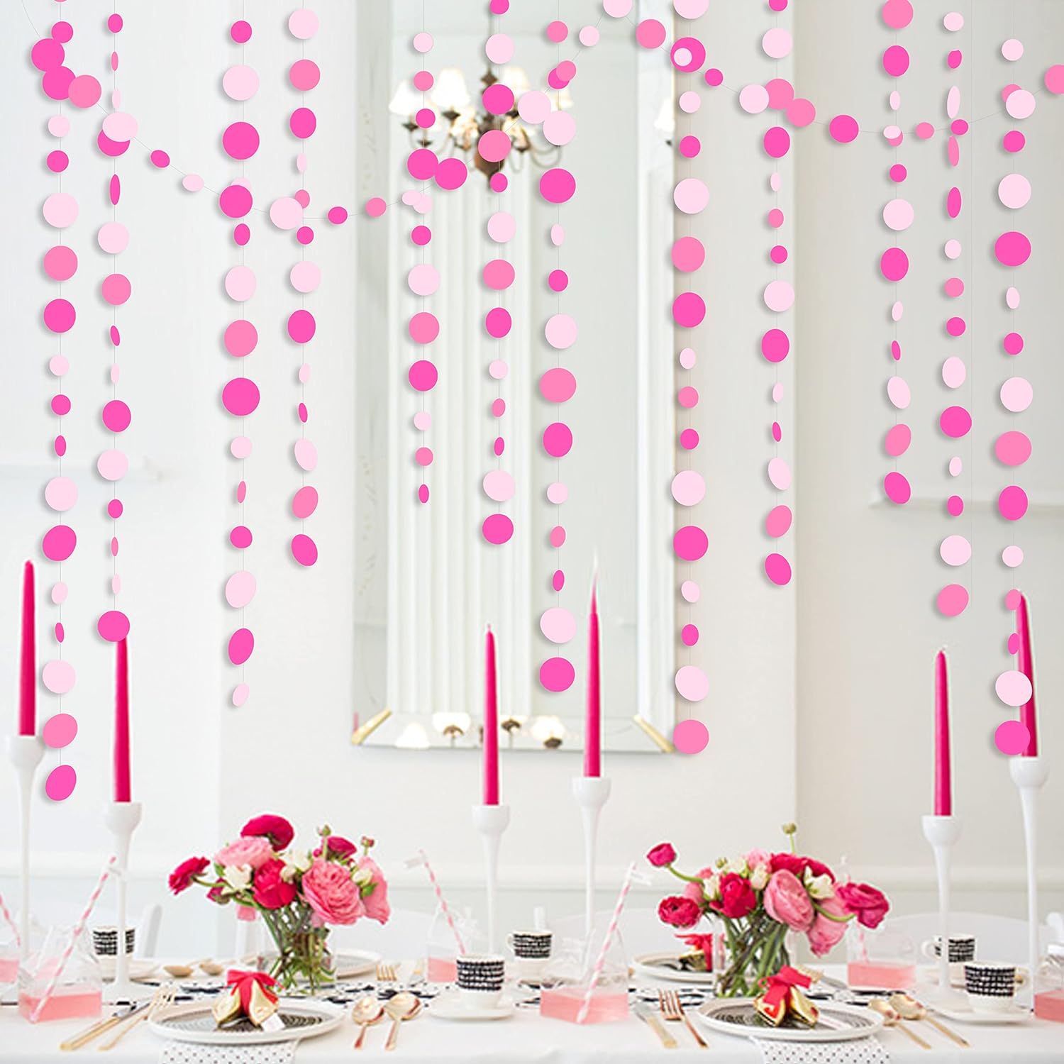 Hot Pink Party Decorations Circle Dots Garland Rose Pink White Hanging Paper Polka Dots Streamer for Birthday Bachelorette Engagement Wedding Baby Bridal Shower Anniversary Minnie Theme Party Supplies