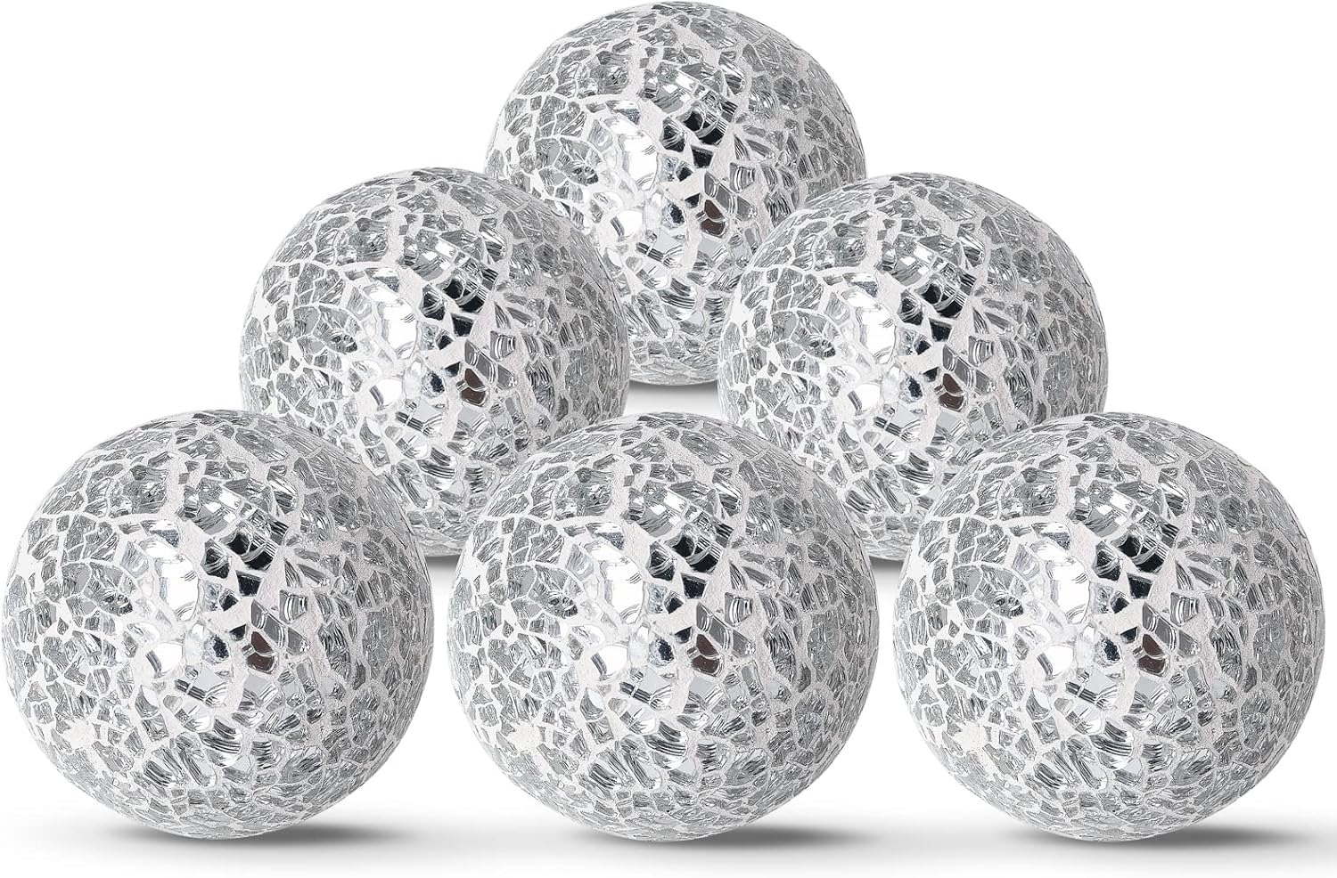6Pcs Decorative Ball Set, 6cm/2.4inch Mosaic Glass Orbs Centerpiece Balls for Decorate Tables Wedding Party (Silver)