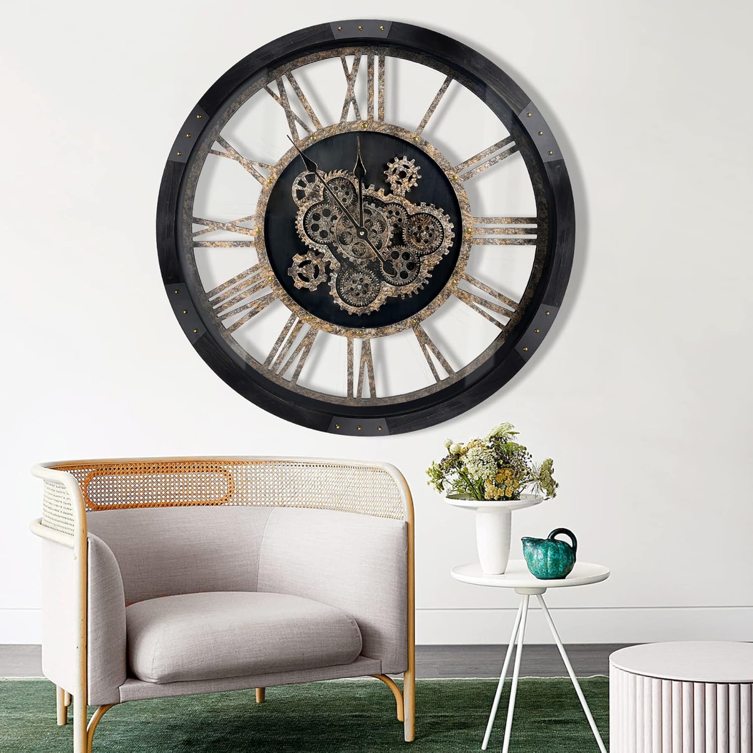 DORBOKER 30" Large Wall Clock Moving Gears,Oversized Industrial Rustic Farmhouse Clocks for Living Room Decor Office Home, Solid Wood Retro Metal HD Tempered Glass Cover,Black and Vintage Bronze