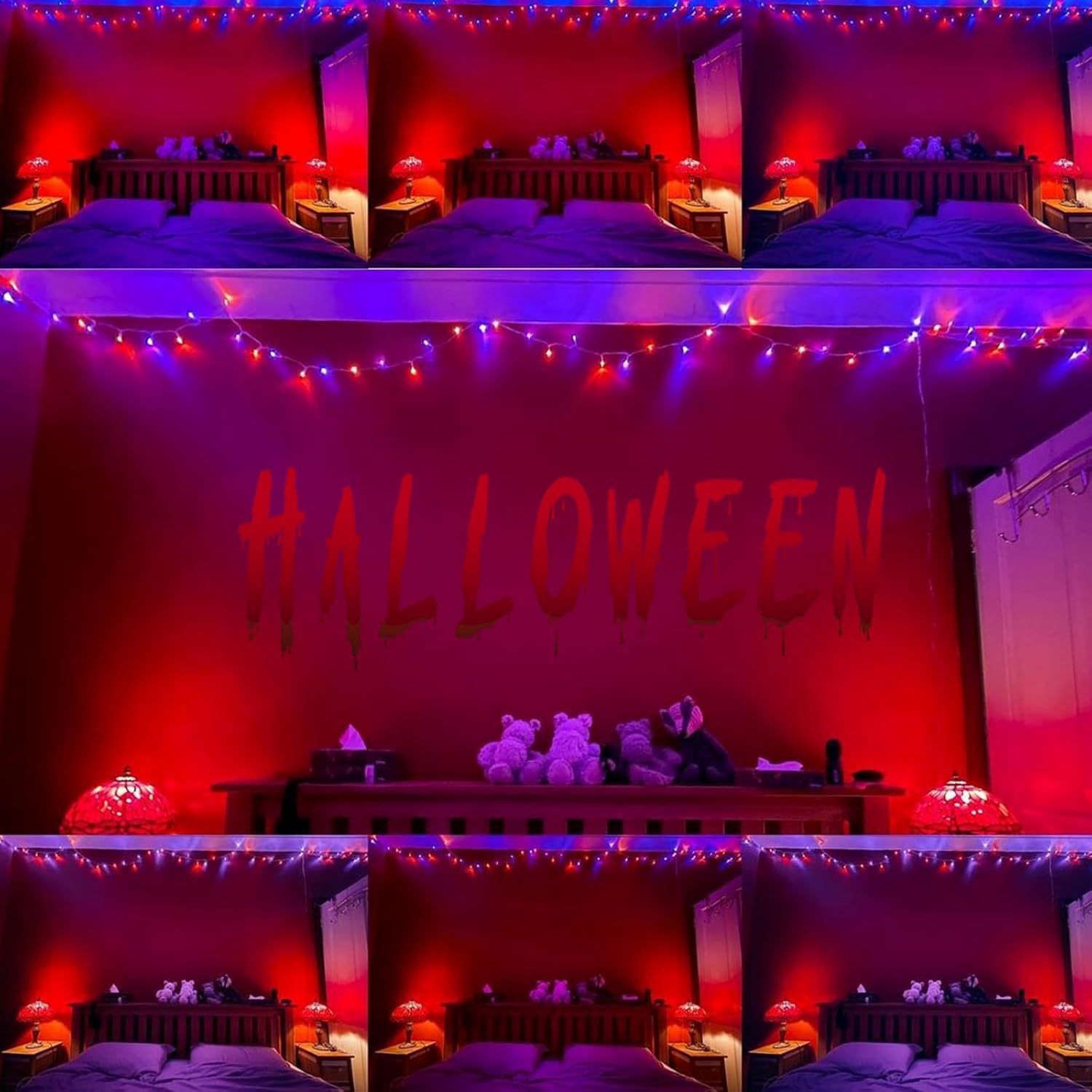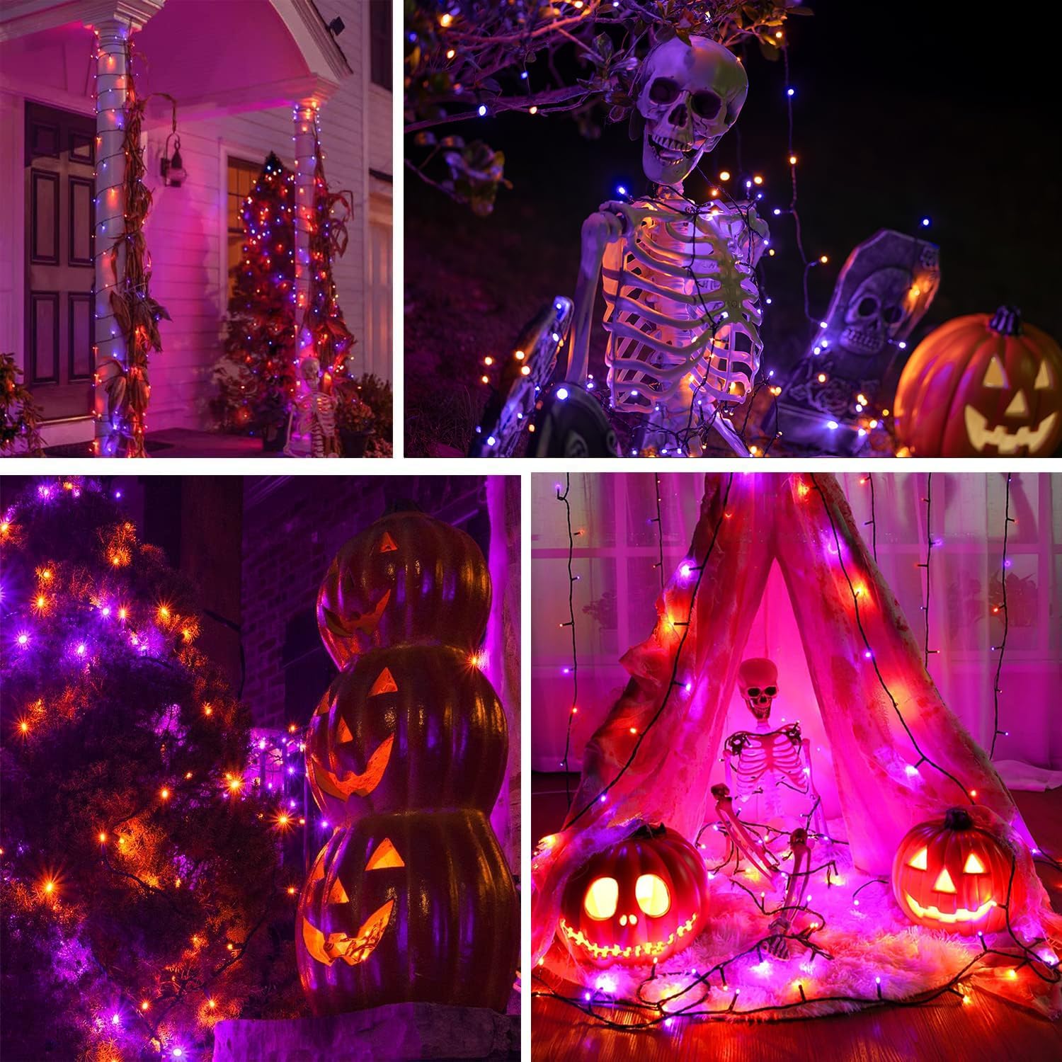 - Orange and Purple Halloween Lights Outdoor: Super bright with new upgraded LED bulbs. This Extendable 200 LED green wire plug in string lights have 8 lighting modes to satisfy your diverse decorative effect. Total length is 75.8ft, of which 66ft with lights.
