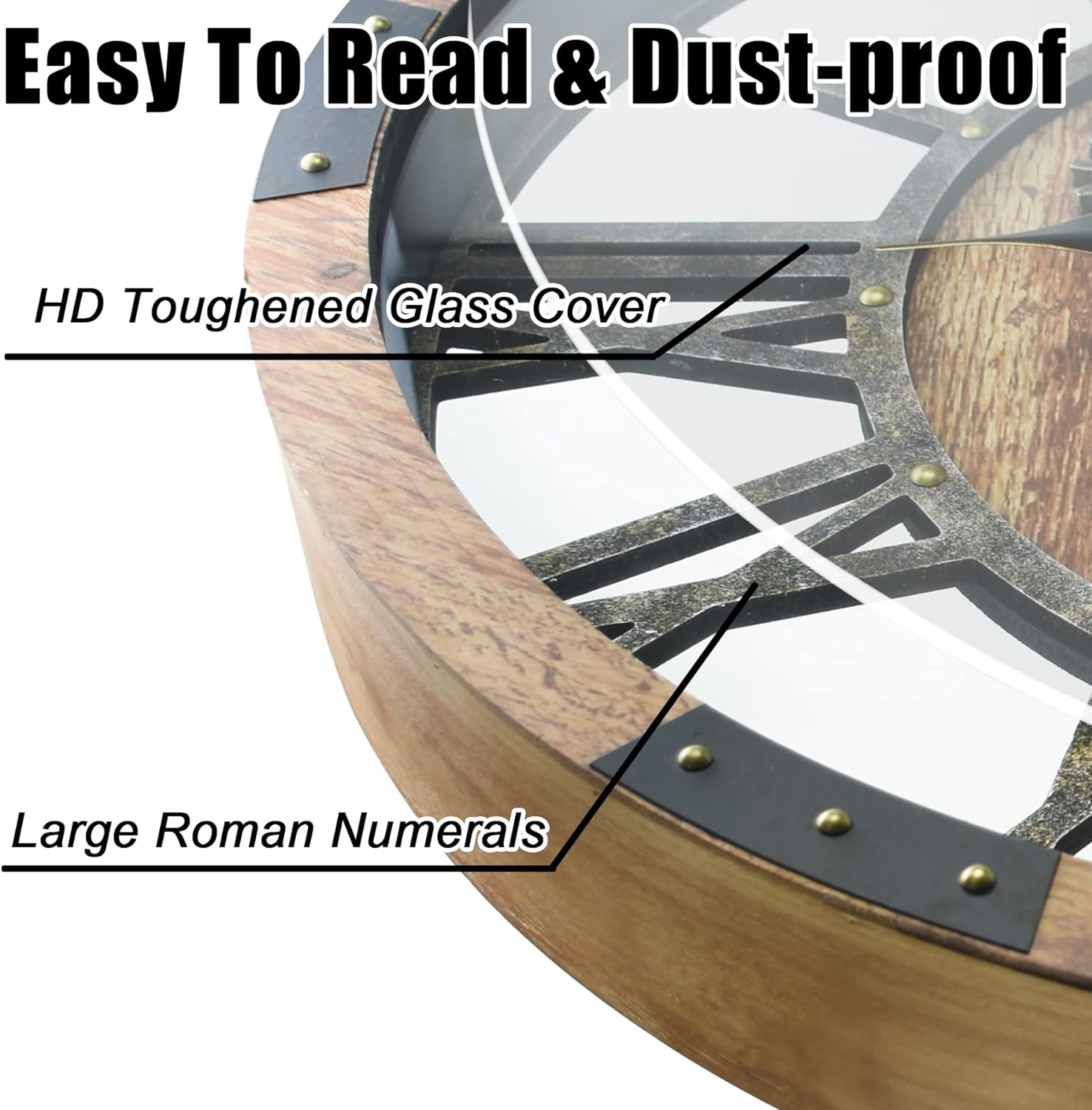 - đ§ăUnique Design, Only For Your Homeă Round solid Wood frame and classic retro skeleton with real mechanical moving gears in the central, the wooden frame is handcraft, showing unique attractive wood grain color and small natural knots; fake rust treatment marks on the skeleton for vintage and industrial effect; stronger tempered glass resists any breakage and keeps safety whenever; The design is very different from other clocks, just to break the ordinary, only for your home.