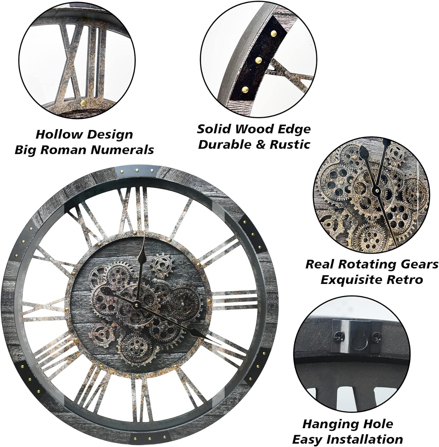 - đ§ăReal Moving Gears Wall ClockăThe large rustic wall clock is design with multi-real moving gears, put battery in, various gears start working, makes a subtle relaxing sound and makes a living element in the environment in where it is placed, vintage and magical, catch all eyes of visits
