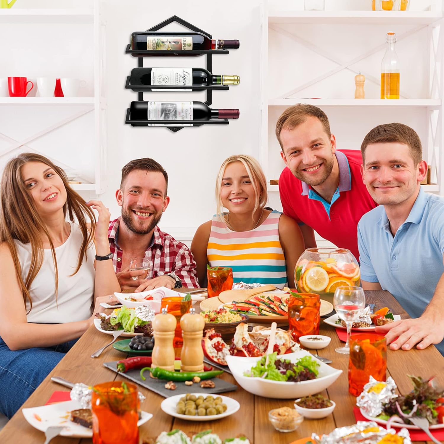 - ăSpace SaverăHanging design can save more countertop space, Wine bhottle rack with integrated storage shelf.It is enough to make room inside your cabinets, on your counter top and in your pantry closet.