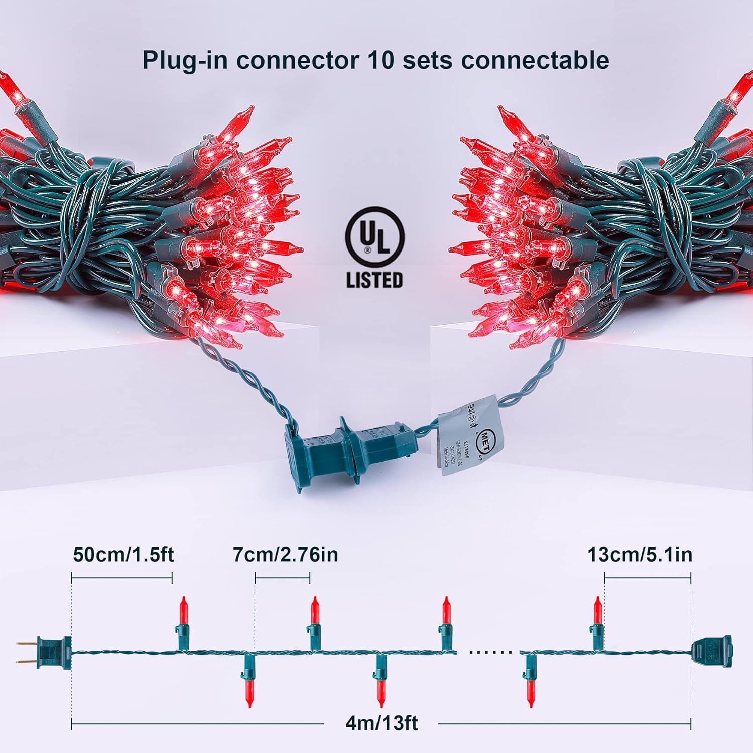 - 🎀Safe to Use : 50count Red Christmas string lights are UL certified and the quality is guaranteed. Our Christmas strings lights have built-in fuses, which will protect the short circuit caused by the damaged wire and can effectively prevent the possibility of fire. High quality use rest assured. Warm tips: Please kindly protect these string lights from immersing in water and keep the plug dry.