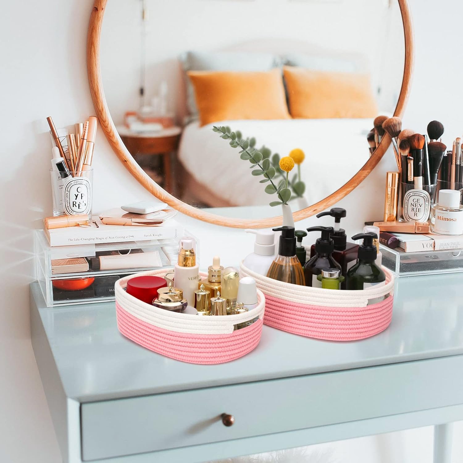 7 Piece Cotton Rope Woven Basket Set - Small Basket for Baby Nursery, Pets, Montessori, Dog & Cat Toy Boxes, Bathroom Organization Bins (White/Pink)