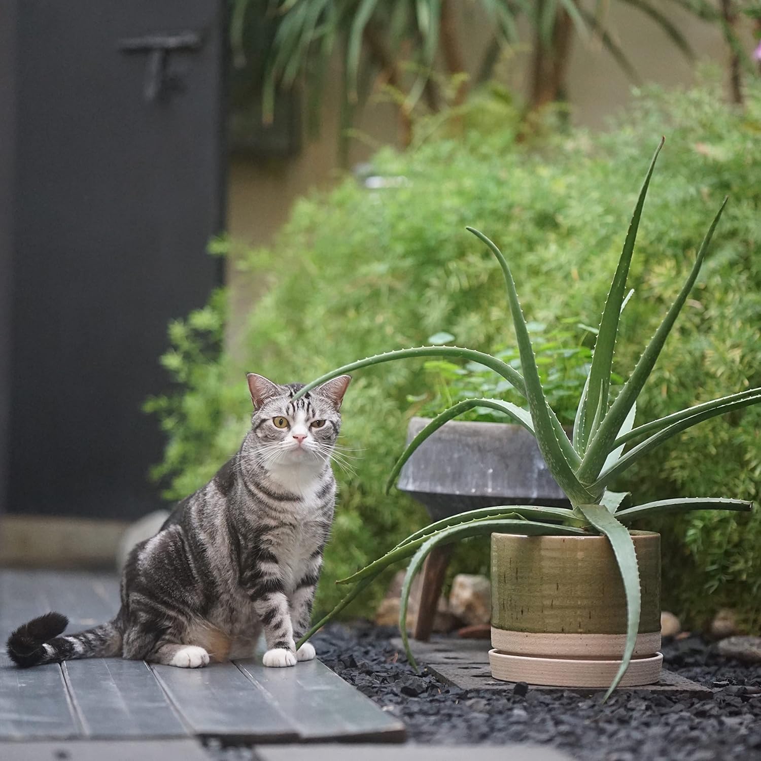 6 + 8 Inch Plant Pots, Ceramic Planter Pot with Drainage Hole & Saucer, Indoor/Outdoor Cylinder Round Planter Pot, Green