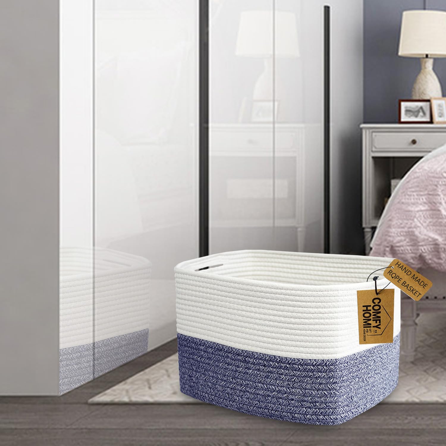 COMFY-HOMI Medium Cotton Rope Basket With Handles for Shelves|Dog Toy|Baby Gift Basket Empty for Organizing|NEW Generation 13.5" x 11" x 9.5" Living Room (Navy Blue)