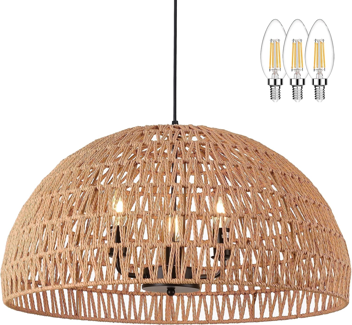 - [Bulbs Included & Dimmable]: Includes 3 regular warm white bulbs with E12 bases. When you buy other dimmable bulbs and combine it with a wall dimmer it can be fully dimmable. The bulb bases have a maximum power of 60W and this wicker pendant has a adjustable hanging rope length so you can use this fixture with confidence.