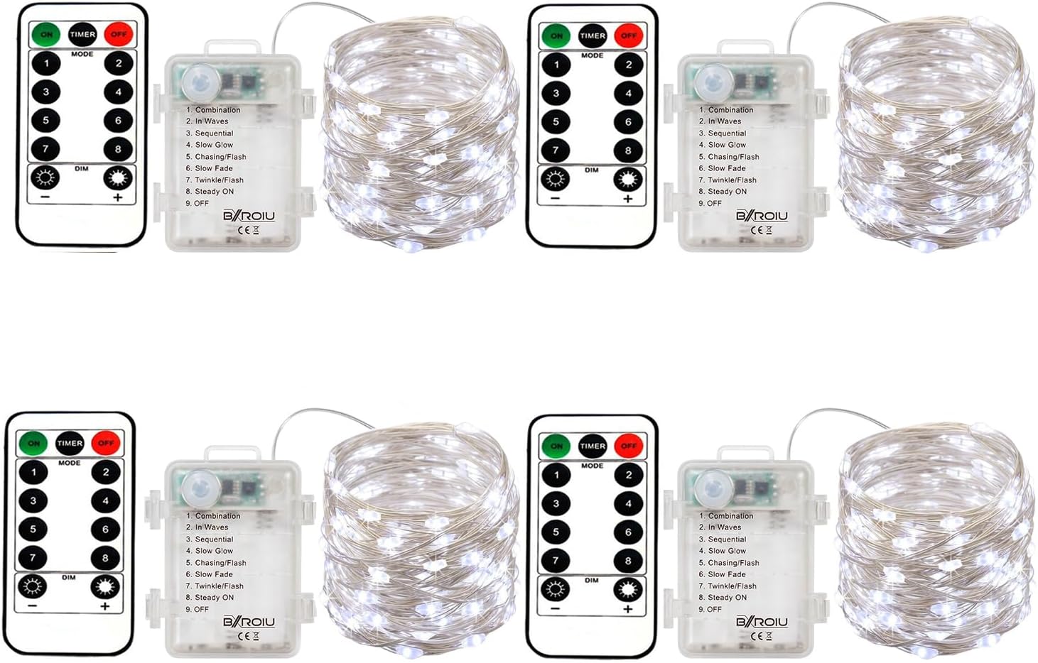 4 x Fairy Lights Battery Operated, Silver Wire Chains 8 Mode 5M 50 LEDs Timer String Lights with Remote Control for Bedroom Christmas Party Wedding Decoration