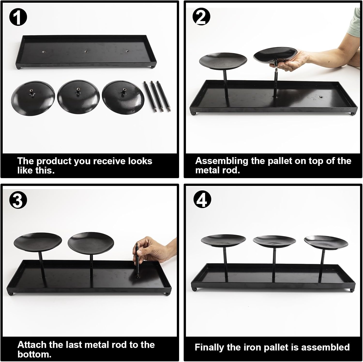 - Size: Base length: 16.14 inch, width: 5.1in, round tray diameter: 4.5in; The height from bottom to top is 4.72 inches. This large metal candle display stand is made of wrought iron. The surface is coated with a protective lacquer that repels water and prevents rust.