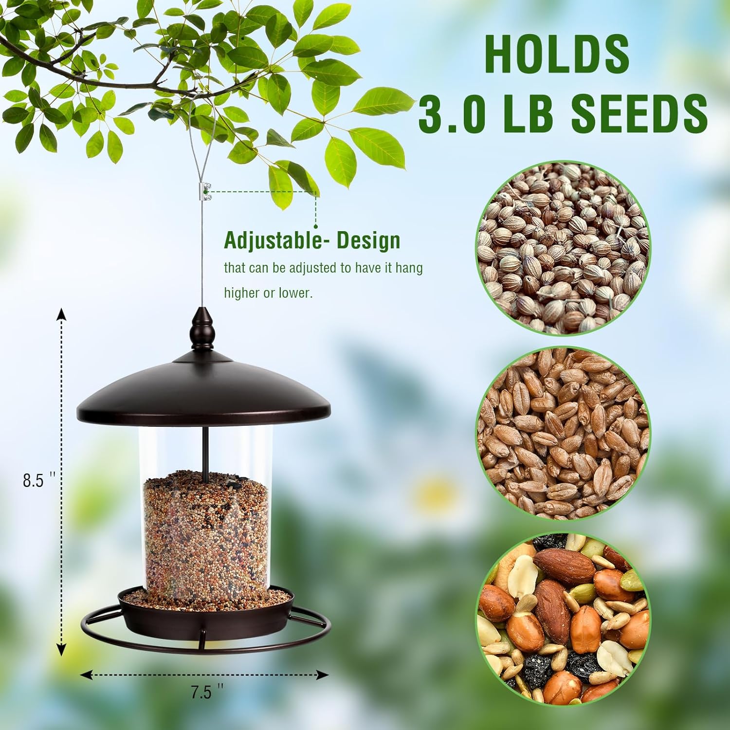 Metal Bird Feeder for Outdoors Hanging,3.0LB Seed Feeder,Easy to Fill & Clean,360° Feeding,Weatherproof Roof for Gardens and Wild Birds,Brown