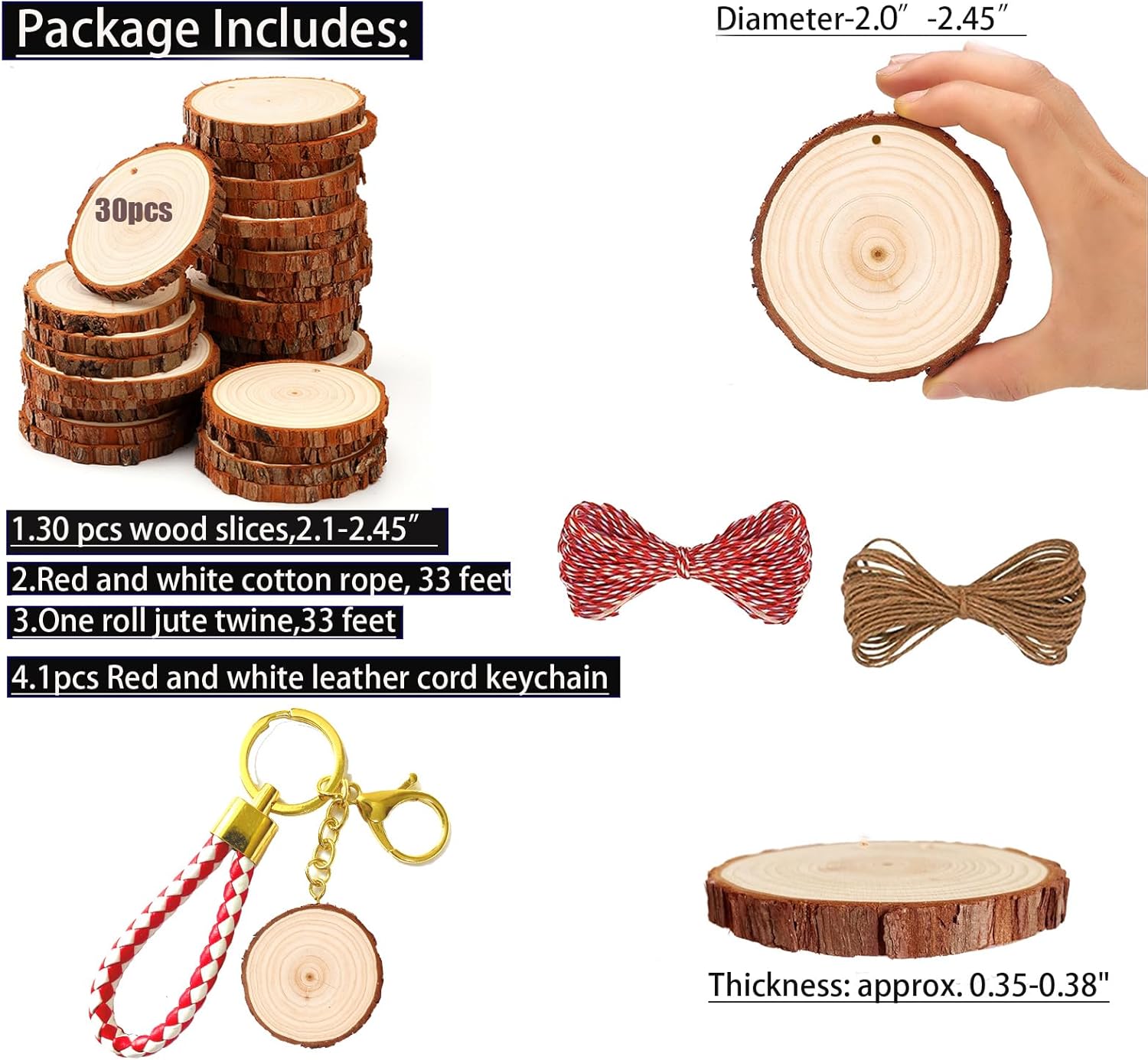 SENMUT Natural Wood Slices 30pcs 2.0"-2.45" Predrilled Wood Circles for Crafts Christmas Wood Slices for Crafts Round Wooden Discs DIY Wood Ornament