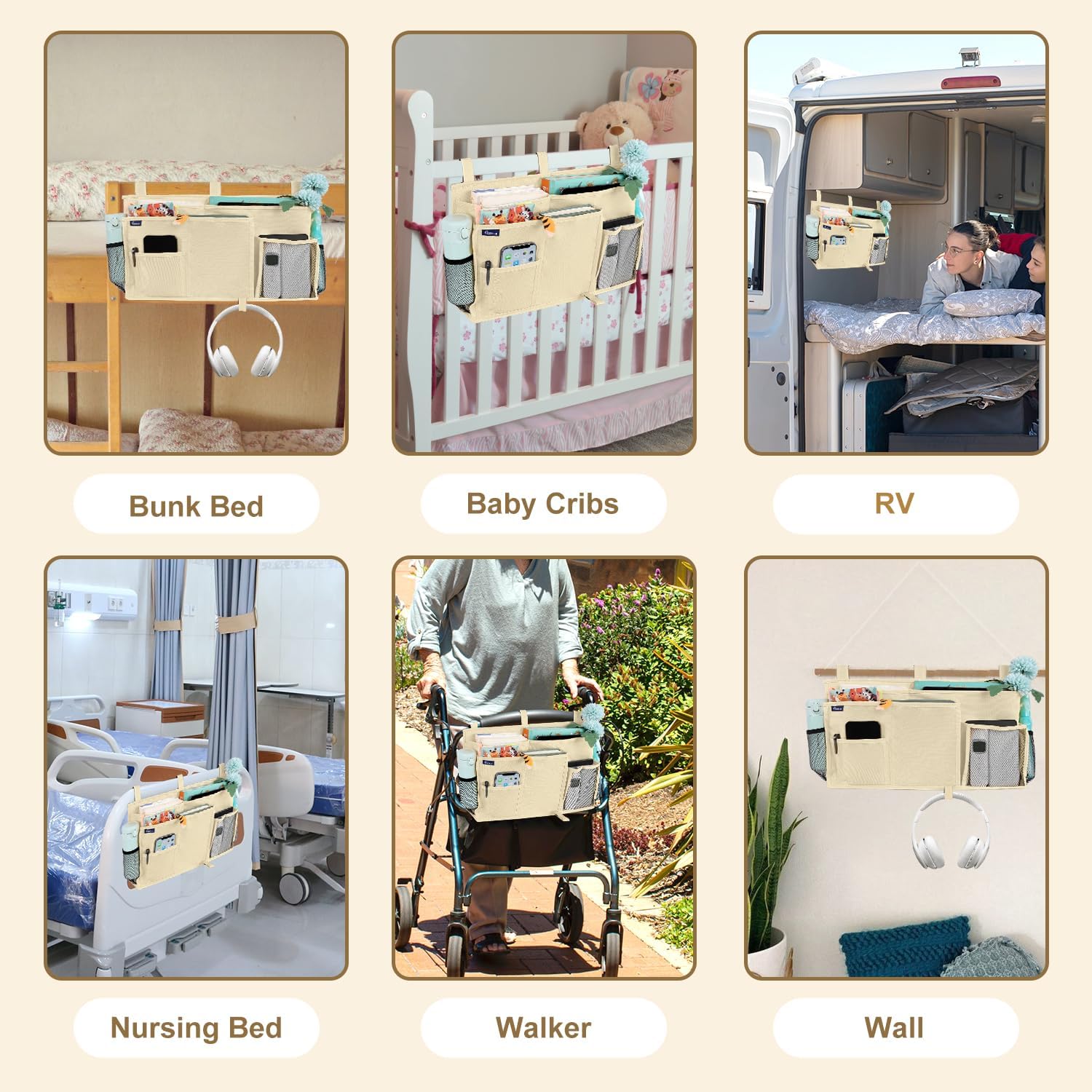 - Multi-Purpose: The bedside organizer is suitable for kid beds, top bunk beds, chair arms, and baby strollers, a good choice for RV, home, hospital, living room, or college dorm.