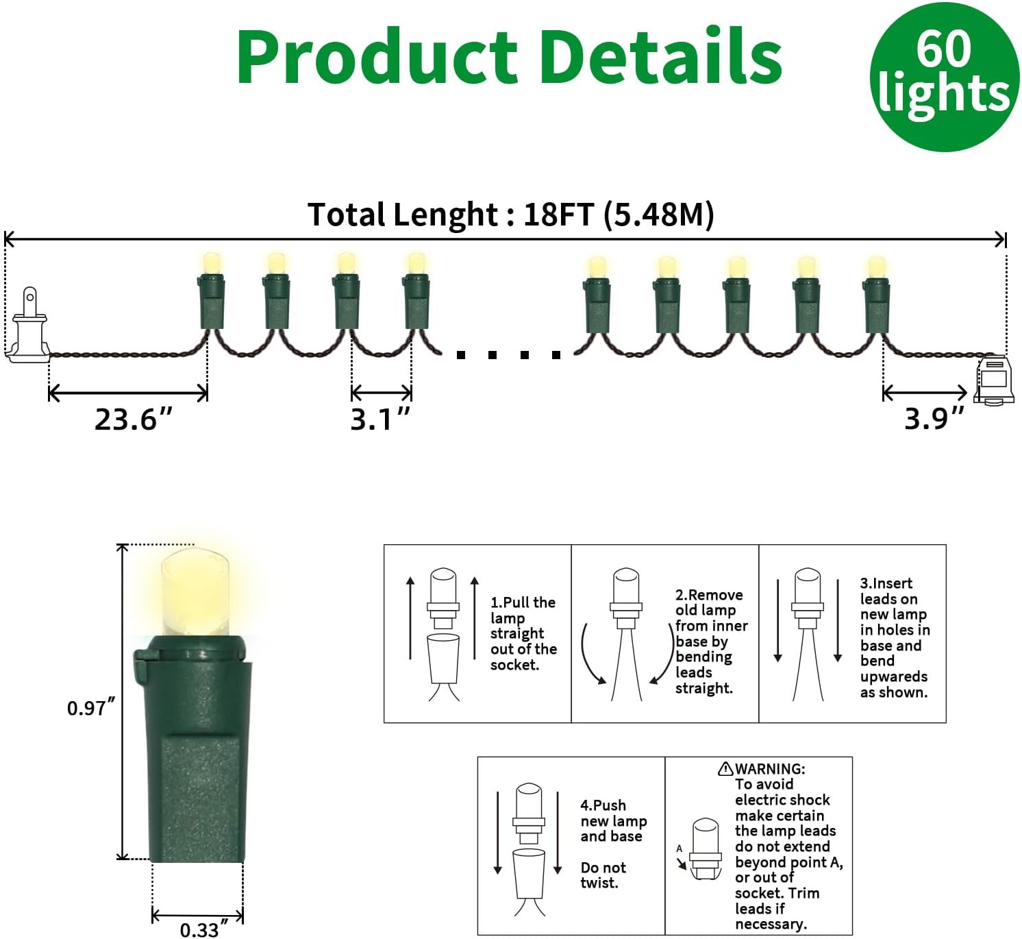 - 5mm LED Christmas Lights: 60 counts warm white 5mm wide angle stable LED string lights spaced 3.1 inches apart with green wire. 23.6 inch leads have a stackable male plug and 3.9 inch tails have a female plug for easy end to end connection.