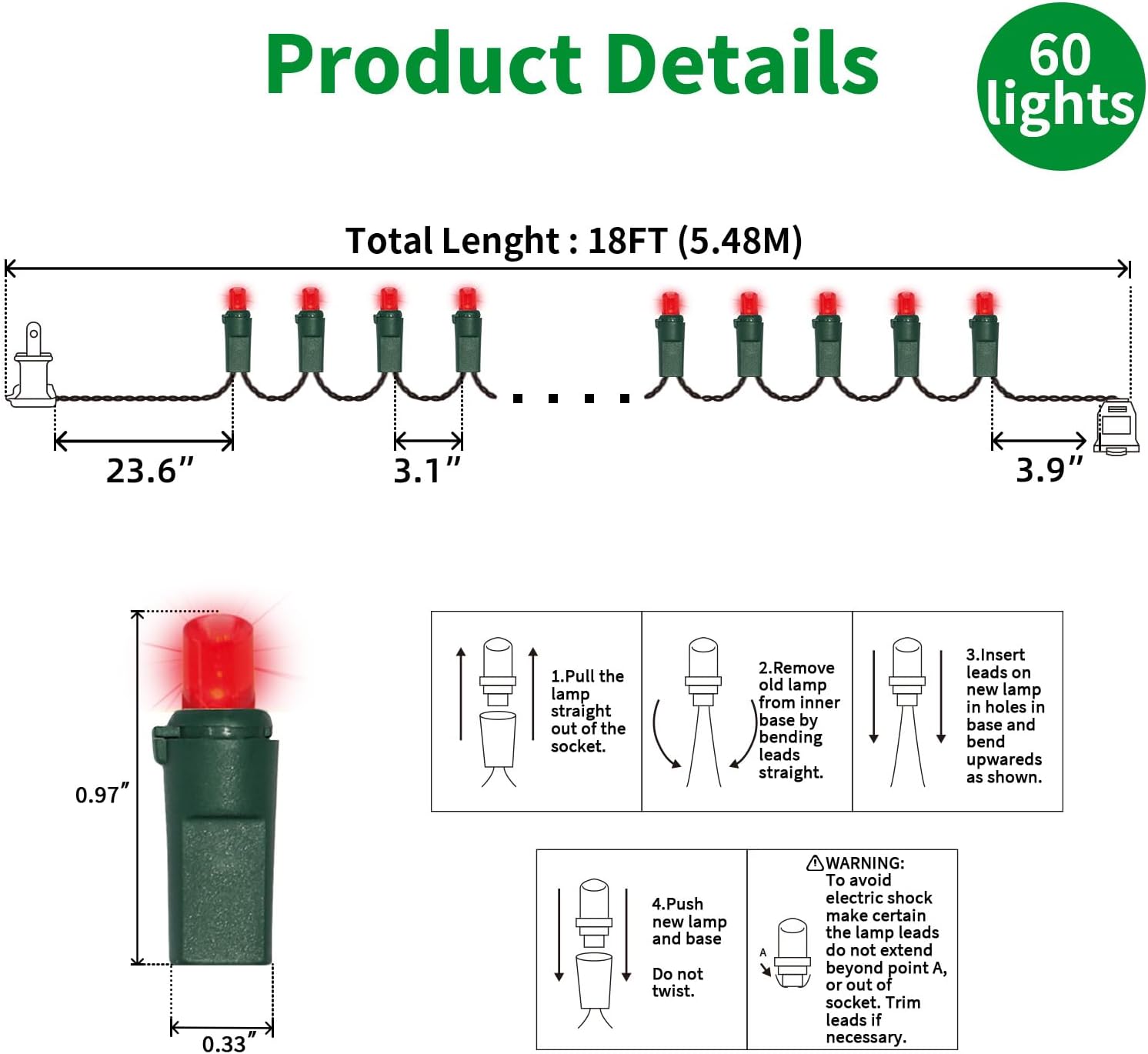 - 5mm LED Christmas Lights: 60 counts Red 5mm wide angle stable LED string lights spaced 3.1 inches apart with green wire. 23.6 inch leads have a stackable male plug and 3.9 inch tails have a female plug for easy end to end connection.