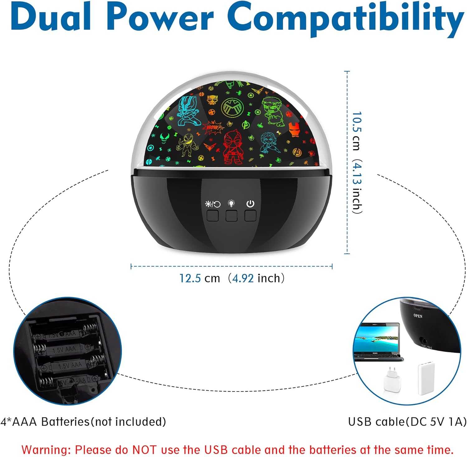 - Two Film Themes to Select: a cool superhero theme and a fantastic starry moon theme, our kids can change it freely. it brings joy and wonder to your child's space. it can decorate the baby's room, nursery, and bedroom decoration. It can accompany boys and girls in growing up to overcome the scare of darkness, best gift for little baby