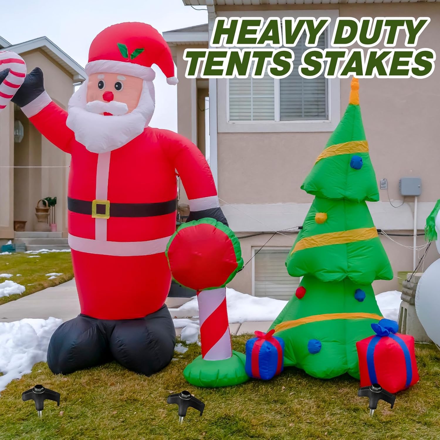 - Easy to Use: our inflatable decoration stakes have pointed tips that are easy to insert into hard soil, and the spiral design offers a stronger grip; With the help of a cordless drill or impact driver, these easy-to-use stakes will have your inflatables, tents, canopy, gazebo, awning, guy lines or tarps grasp the ground in a second