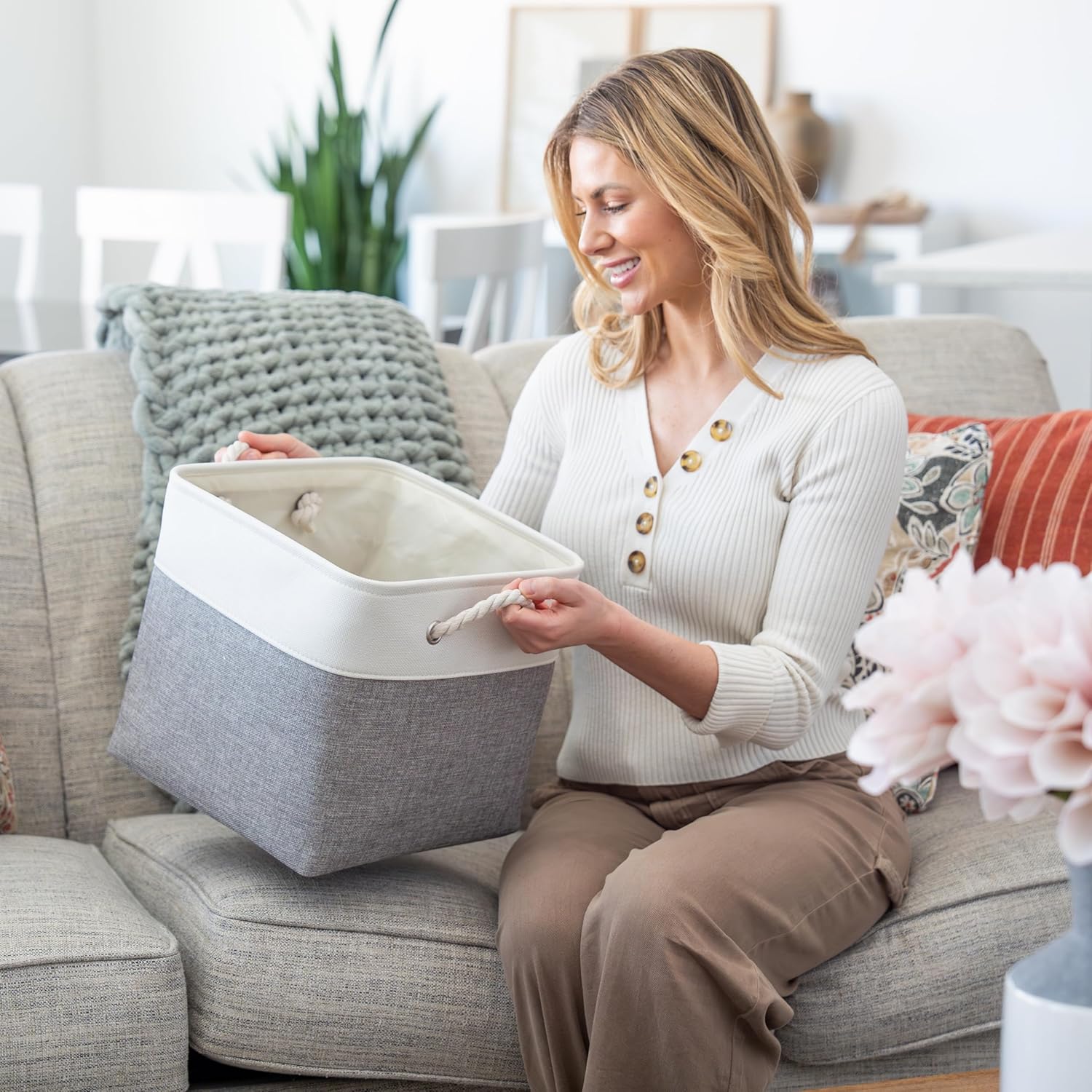 - Decorative Fabric and Rope Handle - These versatile storage baskets for organizing your everyday life are made with a thick, high-quality fabric and fitted with rope handles to add a stylish touch to a living room, bedroom, office, or personal space.