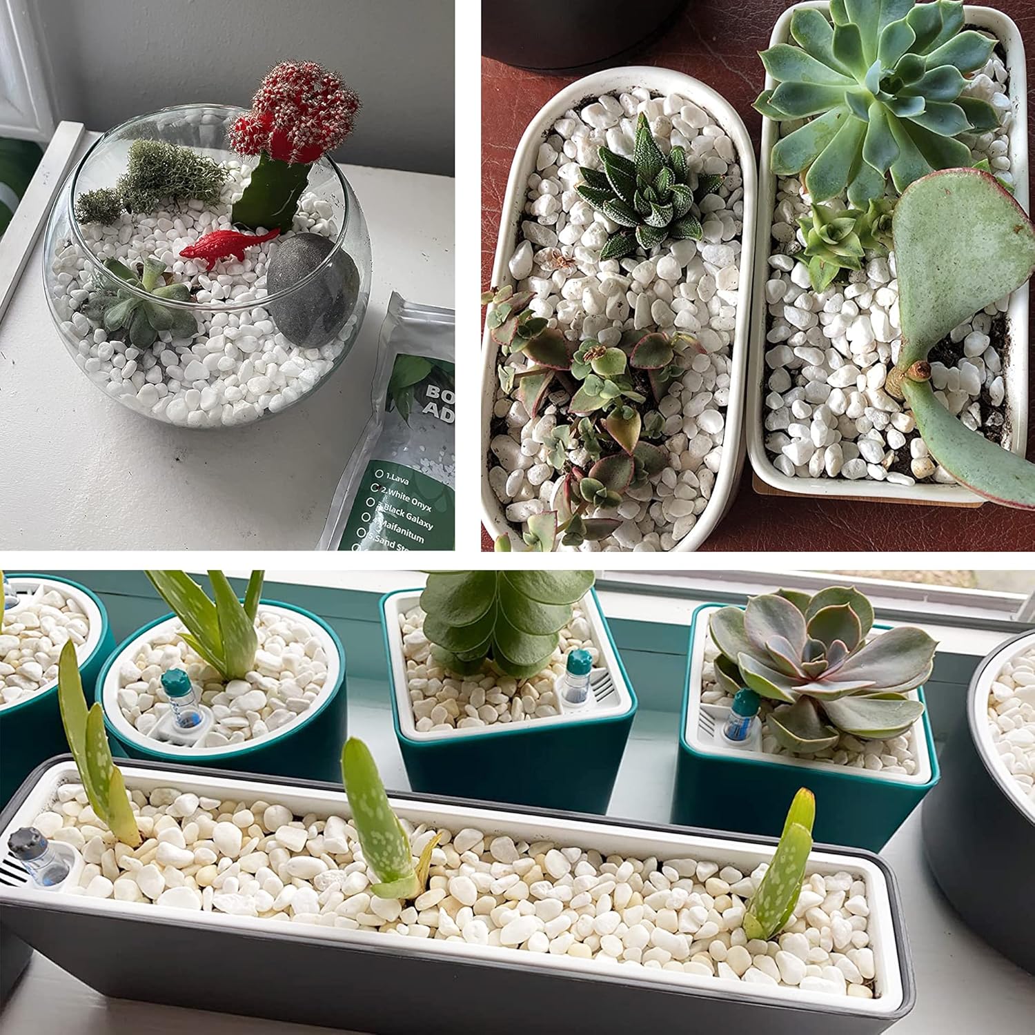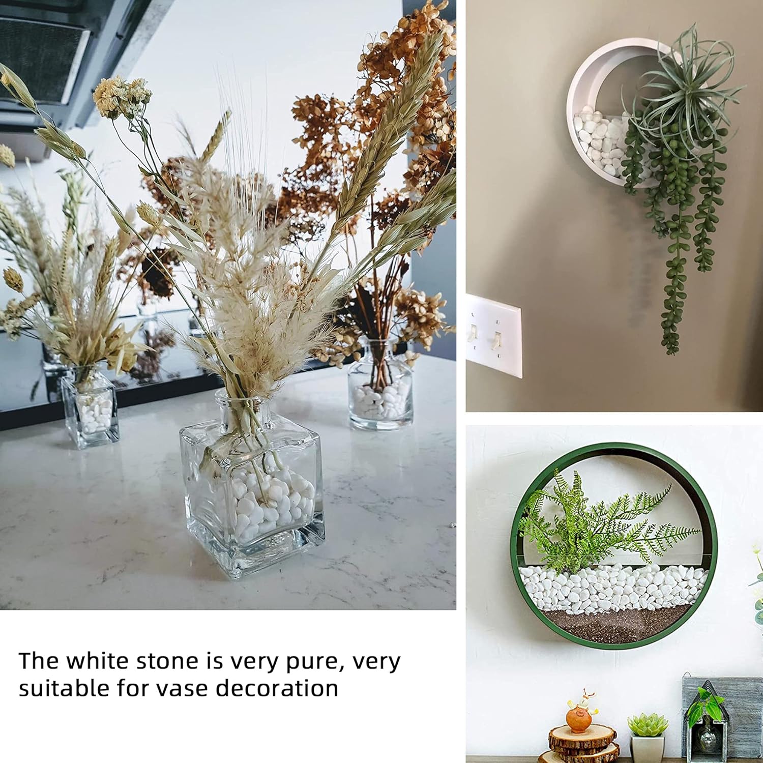 - đŒăWIDE USESăCommon applications include succulent containers, potted plants,vasesïŒcactusïŒbonsaiïŒlandscapeand terrariums.It is perfect for home decor and a creative interior and exterior design. The possibilities are endless with these floral arranging white gravel rocks!