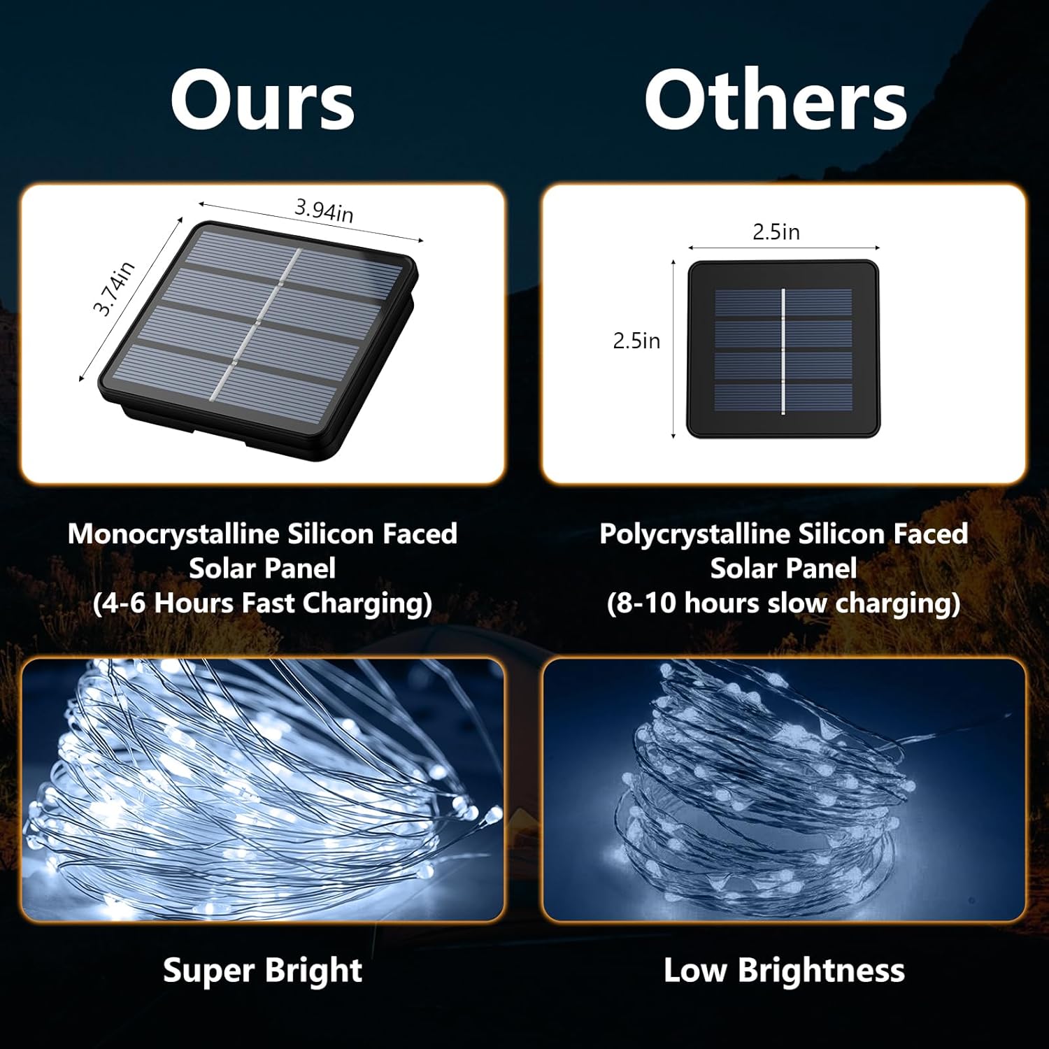 - [2023 NEW UPGRADED LIGHT SENSOR] -- Starlight solar string lights use the latest bulb technology, which enlarges the light beads and also reduces power consumption. It also uses more advanced monocrystalline silicon solar panels that can receive and store the sun's energy and then release it efficiently. Whether it rains, sunsets or snows, all modules are IP65 waterproof, making them suitable for indoor and outdoor use without fear damage (canno be submersion in water).
