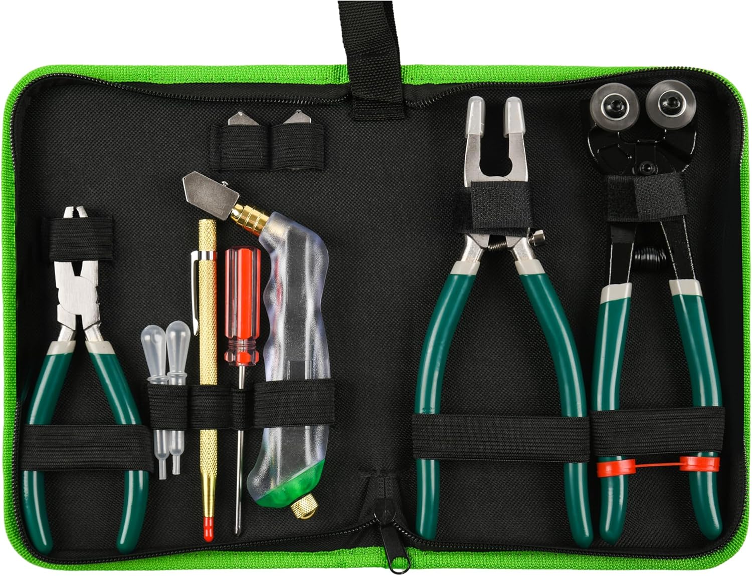 - 【COMBINATION SET】: This glass cutters tools kit contains 1 x pistol type oil fed glass cutter with 2 interchangeable heads (3-12 mm, 6-19 mm), 2 oil drip tubes and 1 screwdriver, 1 movable plier, 1 arc breaker plier, 1 wheeled glass tile nipper and a tungsten varbide tip scriber.
