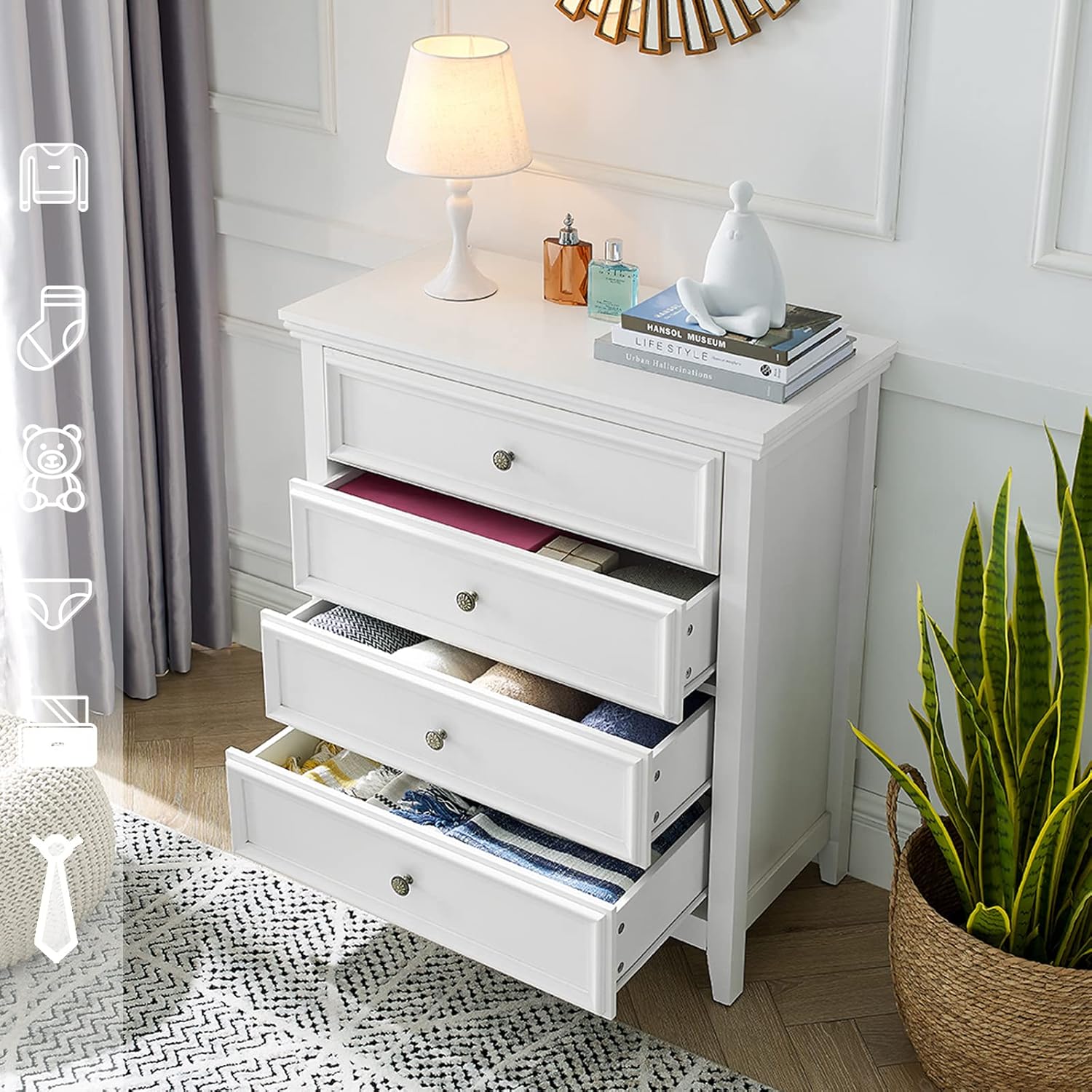 - ăModern Farmhouse StyleăThe dresser is a good choice for the minimalism which made with white smooth closet drawers, metal vintage-style knobs, clear vertical and horizontal lines. It blends perfectly with any kind of decoration style.