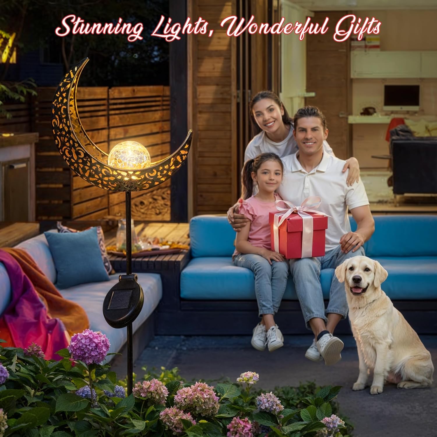 - The crescent moon solar garden stakes design with Warm White 8 Lumens LED, emit stunning glow. The reflection of the pattern is beautiful enough to create a romantic and festive atmosphere in your front porch, back yard,lawn,flower bed or garden.