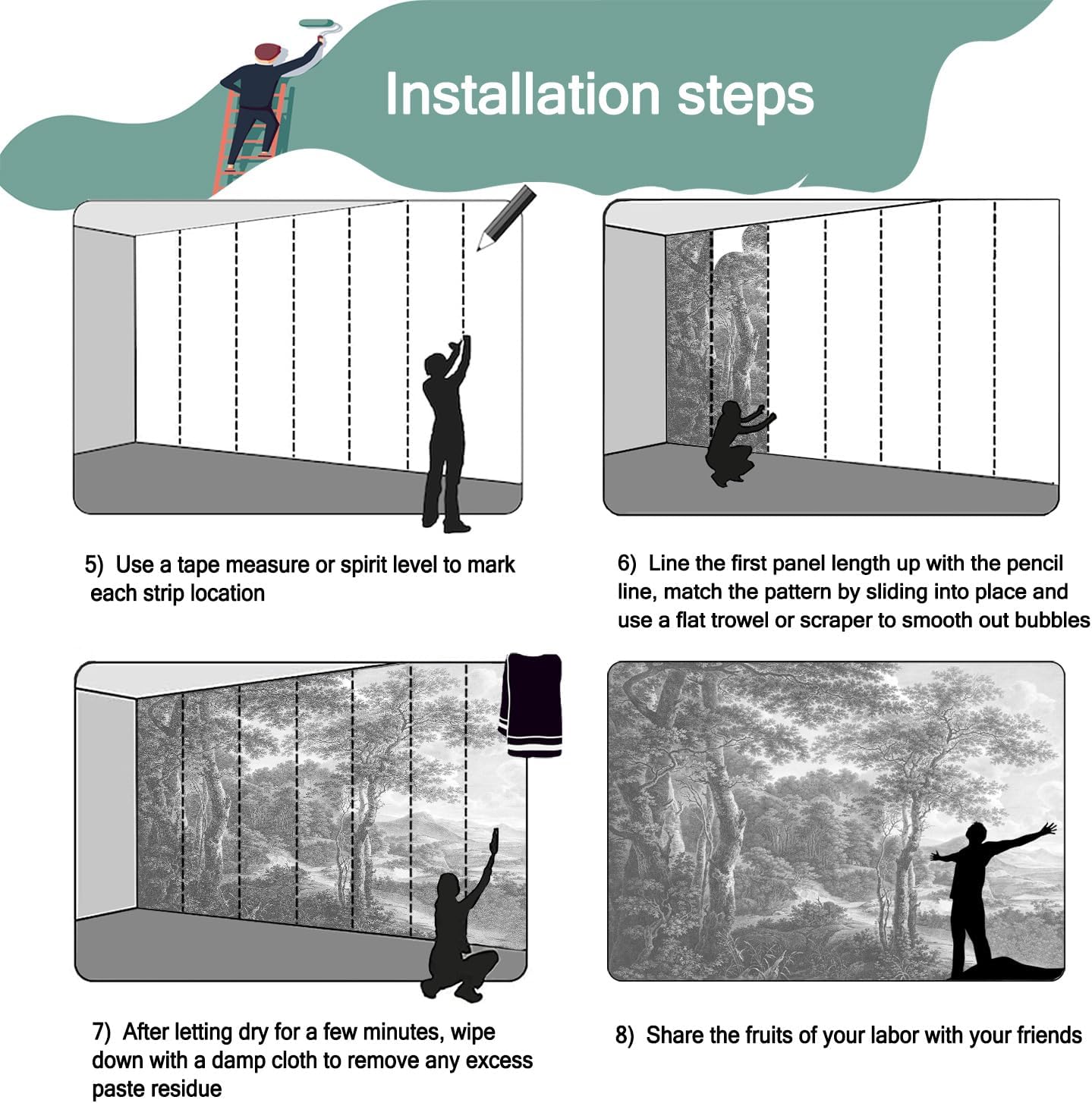 - Mural wallpaper size: 180 "W x 115 "H, divided into 9 sections, each section is labeled with a number underneath, there is no need to overlap the pattern when installing, just install according to the number labeled underneath the panel