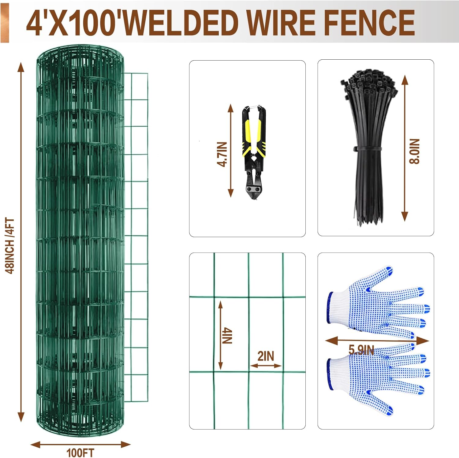 - Welded Wire Mesh Roll: This welded wire fence size is 4 ft x 100 ft and comes in a roll format, allowing you to customize its length according to your specific needs. Whether you need a short section for a small flower bed or a longer stretch to enclose an entire yard, the flexible nature of this welded wire mesh roll ensures a seamless and professional-looking installation.