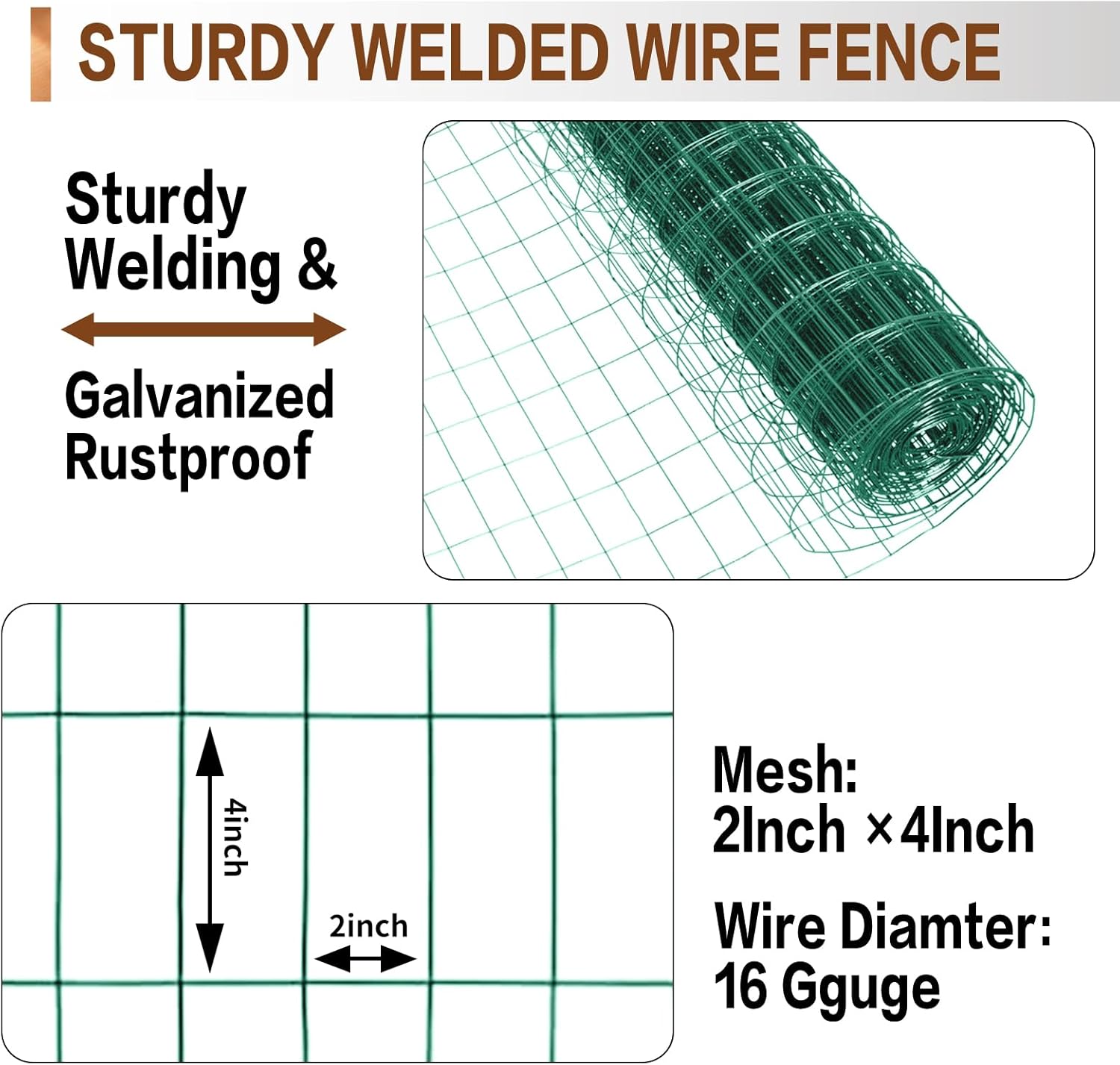 - Sturdy Welded Wire Fence: This welded chicken wire fence manufactured using advanced welding technology to ensure that each solder joint is strong and durable,features a 16GA wire diameter, with 2 inch x 4 inch mesh openings, sturdy enough to effectively protect your yard and poultry safety.