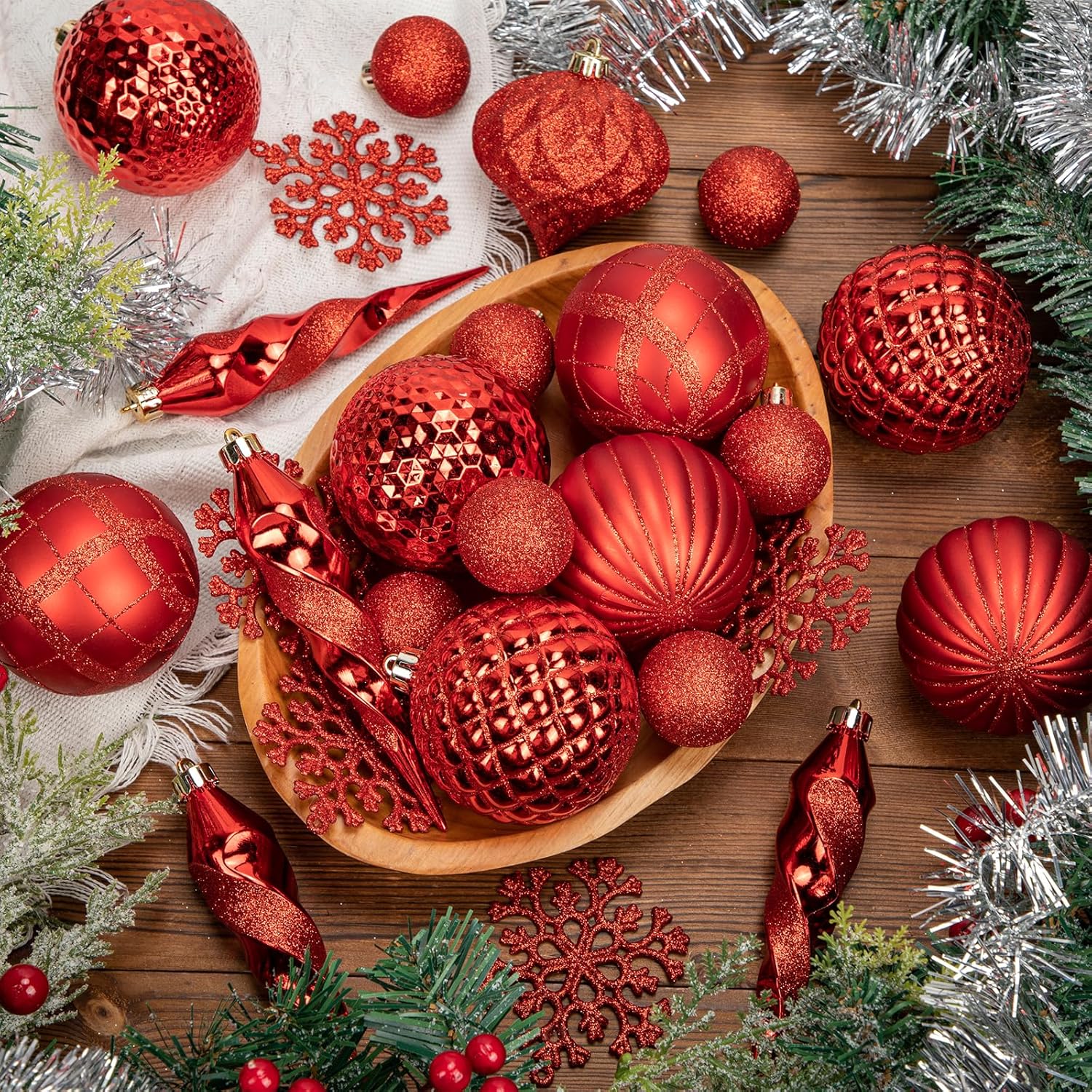 50PCS Christmas Tree Ornaments Set with Shatterproof Balls Icicle Snowflake Hanging Ornaments for Home Office Farmhouse Christmas Decorations, Red