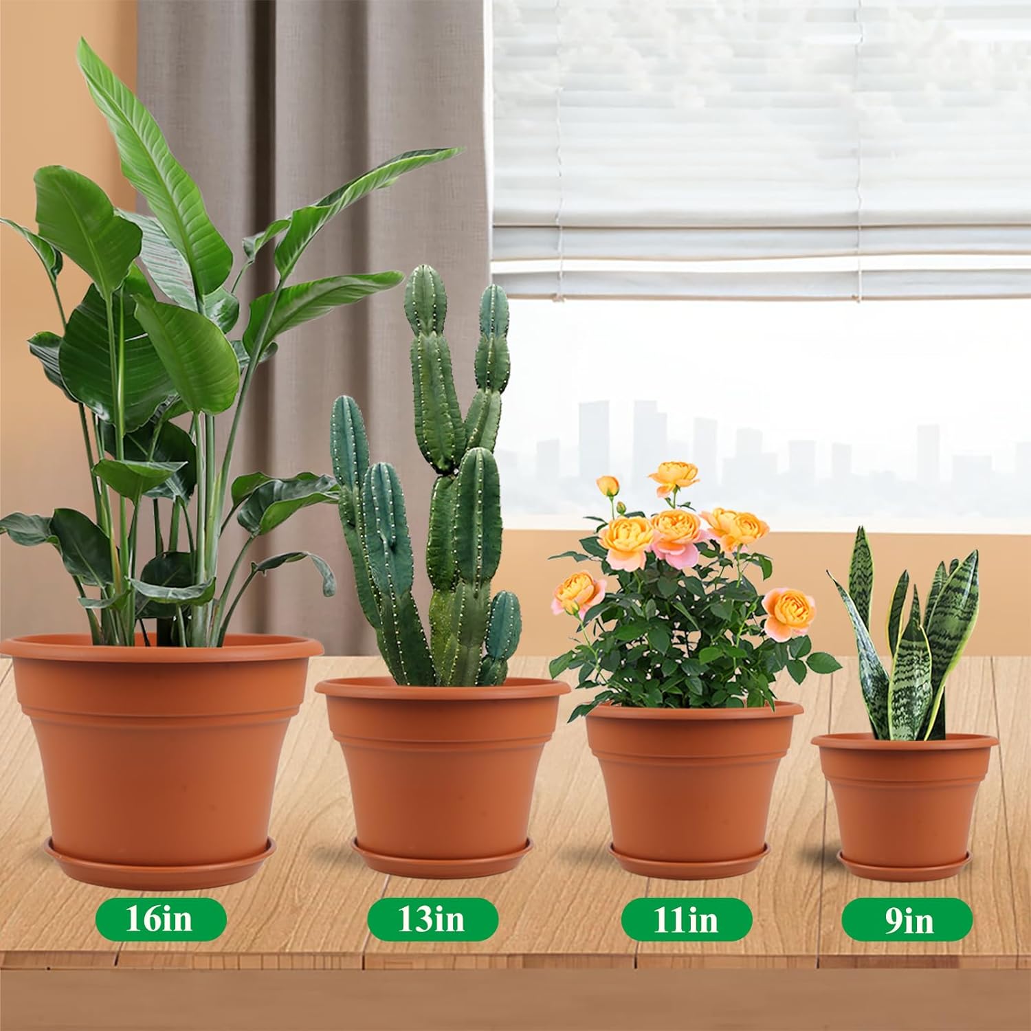 - 【Multiple Sizes to Meet Various Planting Needs】Pot for plants indoor outdoor are available in size 9-11-13-16 inch. Plastic flower pots are perfect for planting a wide range of small to medium-sized plants commonly found in homes and offices. Whether it’s orchids, succulents, herbs, snake plants, mints, cacti, aloes, peace lilies, or more, these garden pots with drainage and saucer are designed to accommodate them all.