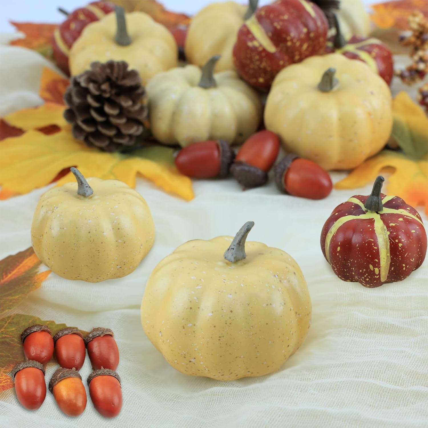 - 【Fall Decorations for Home】 - This fake pumpkins for decorating set includes 23 pcs ( 9 pcs lifelike artificial pumpkins, 6 pcs realistic acorns, 4 pcs rustic pinecones, 2 pcs fall maple leaves, 2 pcs delightful foam berries ), artificial vegatables small pumpkins, and the beautiful Fall decor colors is very suitable for Harvest and Thanksgiving decor theme, especially thanksgiving table decor, fall party decorations, creating full fall sense for home decor