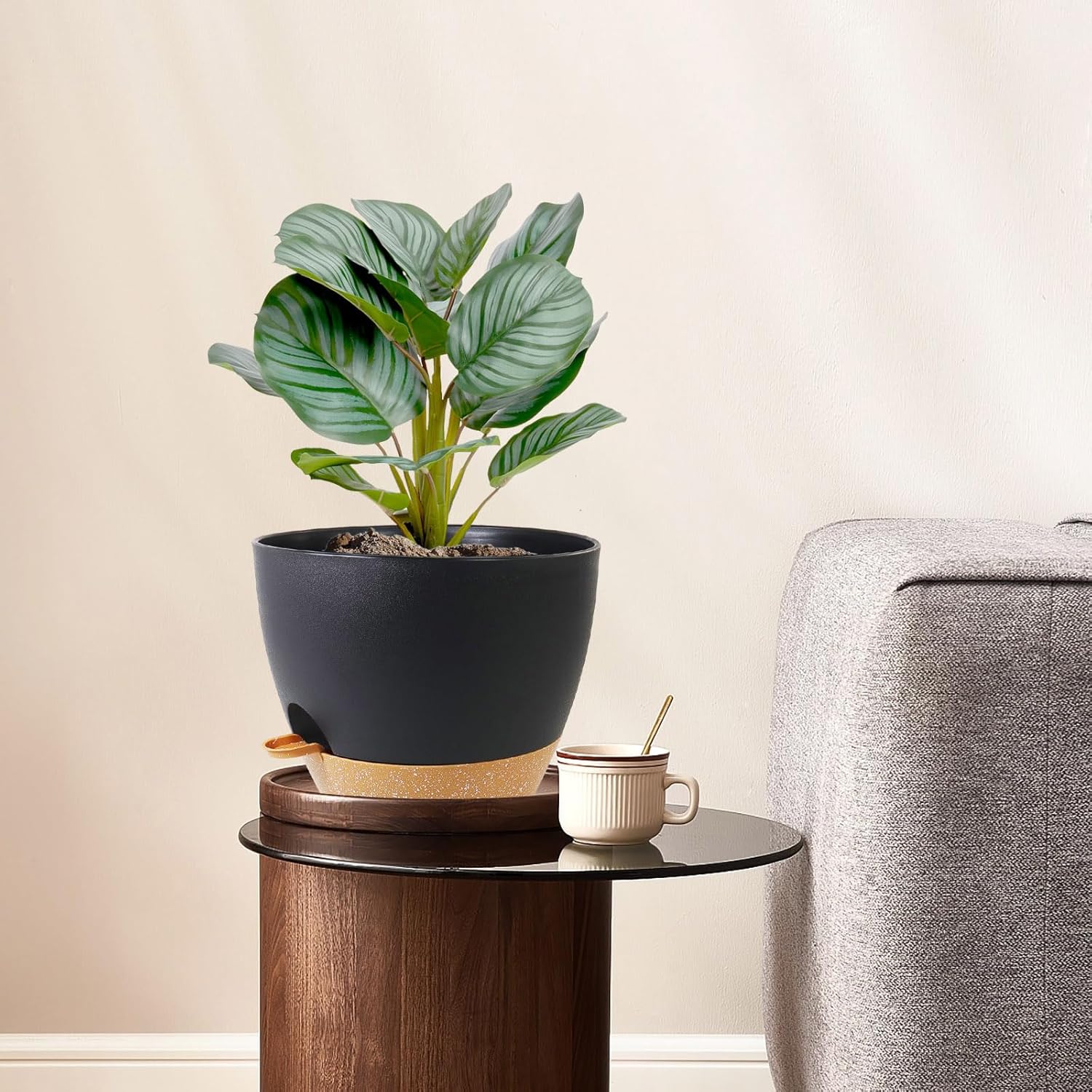 12/10/9 inch Large Self Watering Pots, Planter, Plant Pots with Mesh Drainage Holes for Indoor Outdoor Garden Plants, Plastic Flower Pots with Removable Deep Reservoir, Black with Brown
