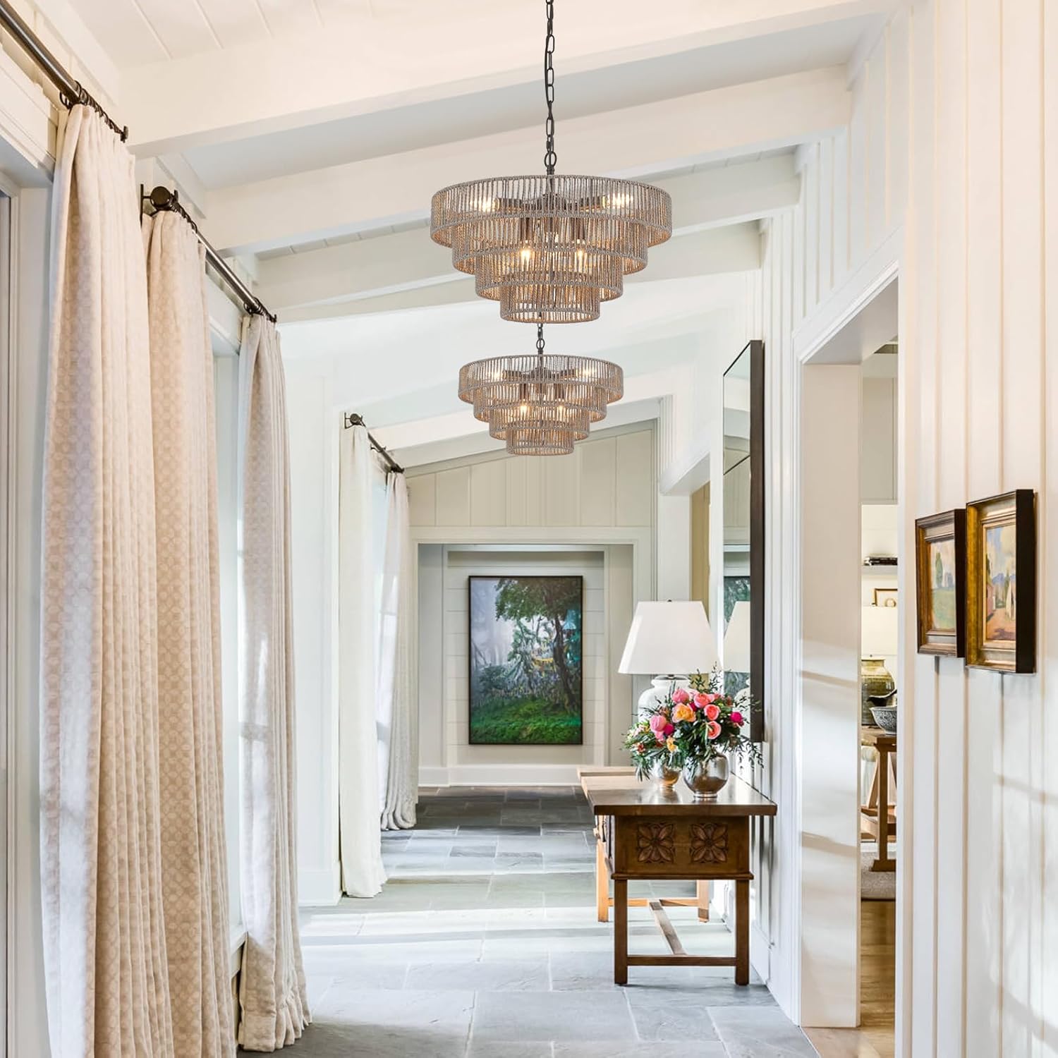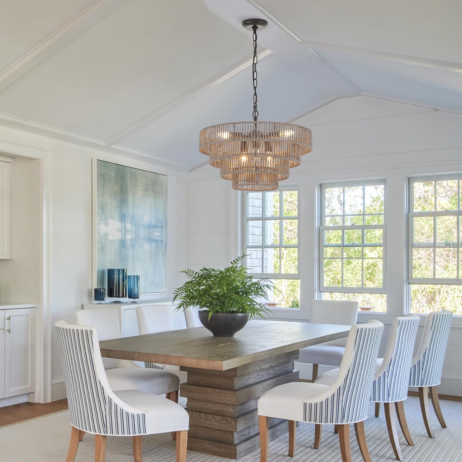 20” Hand-Woven Rattan Chandelier 6-Lights Transitional Minimalist 4 Round Boho Large Coastal Pendant Light for Kitchen Island Dining Room Living Room Hallway, Gray, UL Listed