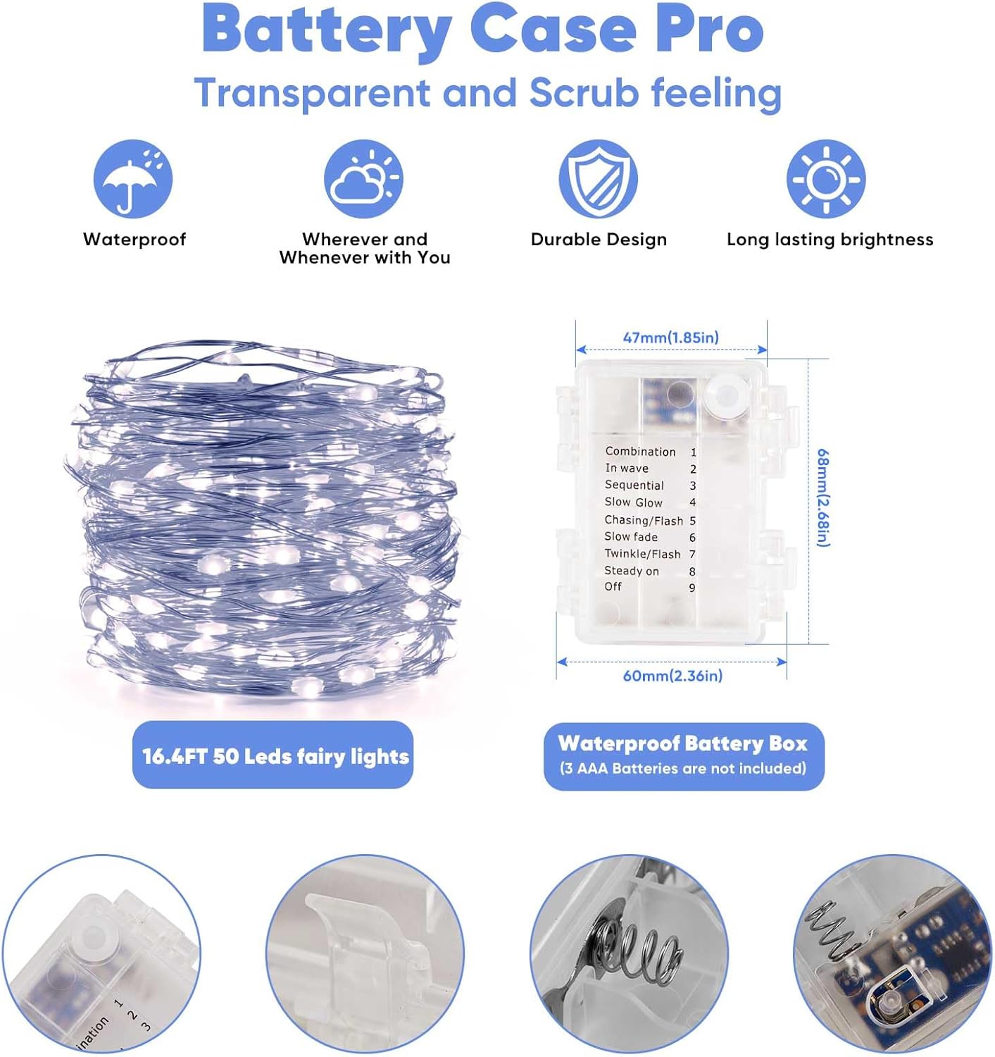2 Pack 16.4 Ft. Battery Operated Outdoor String Lights with Remote & Timer, LED Cool White Fairy Lights, Waterproof Twinkle Lights for Bedroom, Dorm, Mason Jar, Wedding, Party, Christmas
