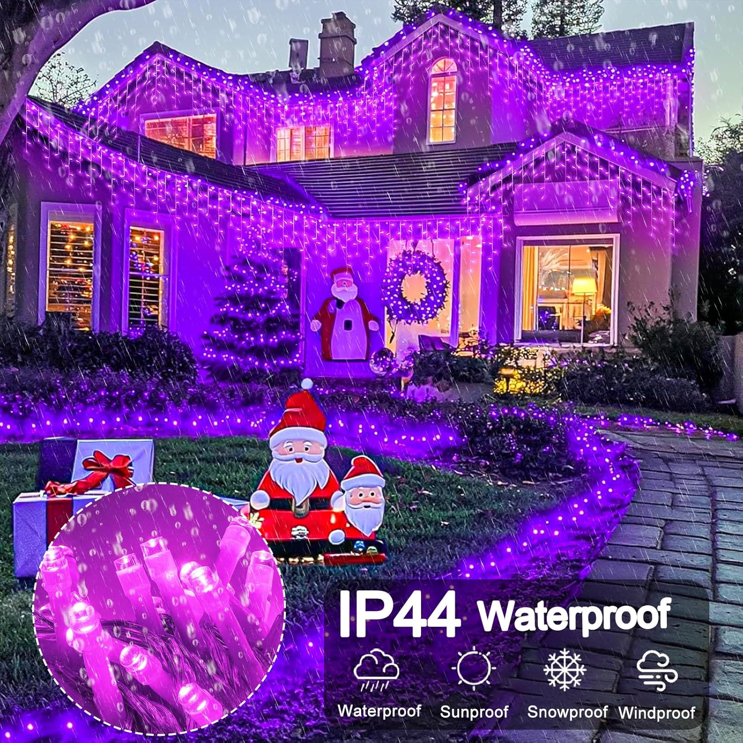 - Waterproof: The outdoor Halloween decorations is perfect for outdoor using, including heavy rain and snow. Sealed LED beads, thick gauge wire and coating all are IP44 waterproof, they make the outdoor icicle lights durable and worked great through the season. But please kindly note that the plug is not waterproof, please do some protection or keep them away from water.