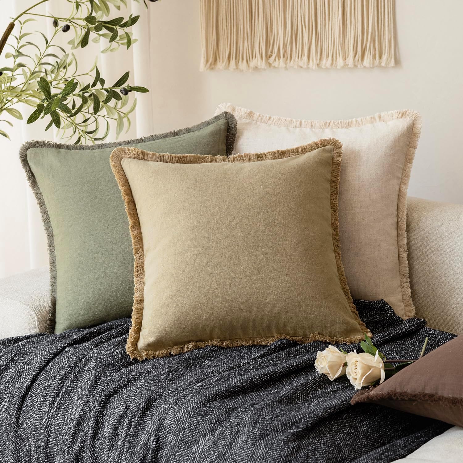 Foindtower Set of 2 Decorative Linen Fringe Throw Pillow Covers Farmhouse Cushion Cover with Tassels Soft Accent Pillowcase for Couch Chair Sofa Bed Living Room Home Decor,18×18 Inch,Light Khaki Taupe