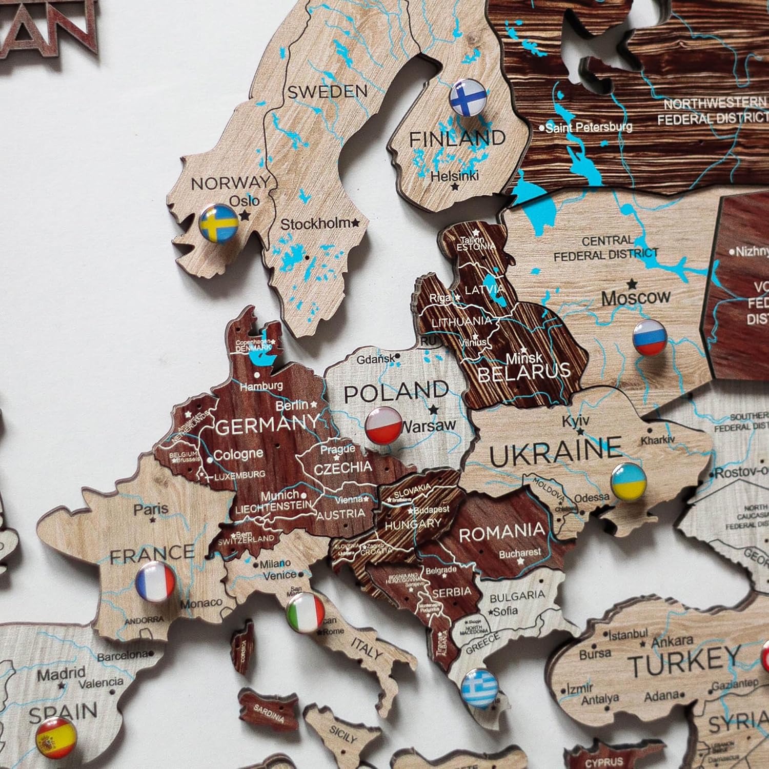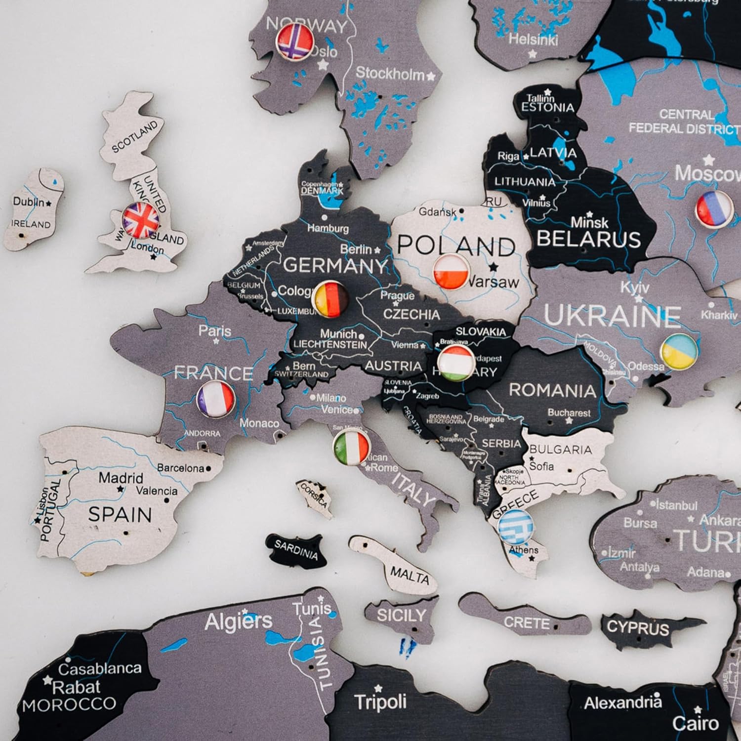 - Premium Quality Construction: This world map wall decor is crafted from superior quality, highly durable birch plywood, available in a selection of 8 colors, 3 sizes and push pins according to your individual needs or preferences.