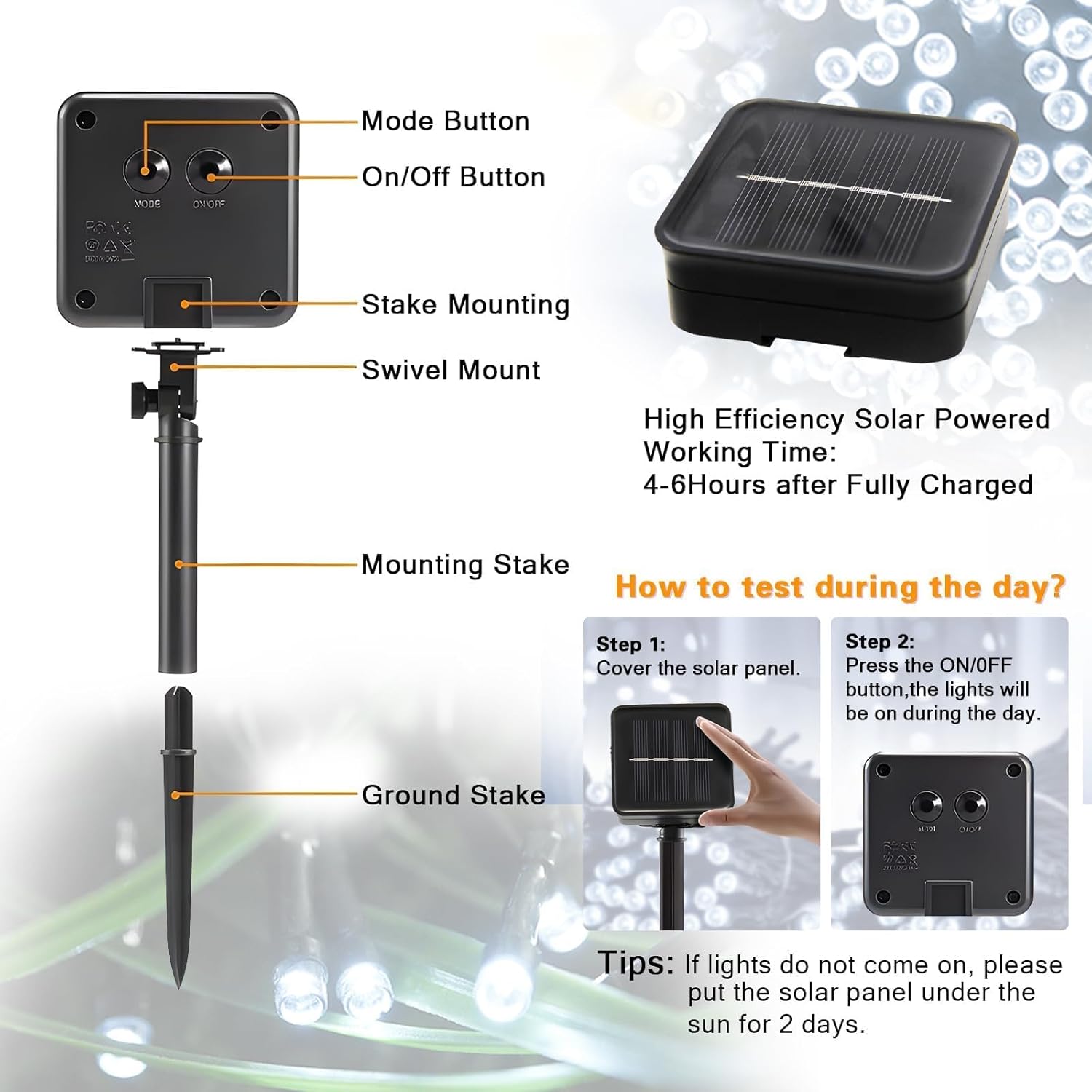 - 【8 Modes & Memorized Light Sensor】Press the mode switch, there are 8 different modes which can be adjusted by the "Mode" button on the back of the solar panel. The outdoor solar light strings also have a memory function that remembers the last set of modes. They utilize light sensing technology, which means they can turn on automatically at night. Now you don't have to reset them every day!