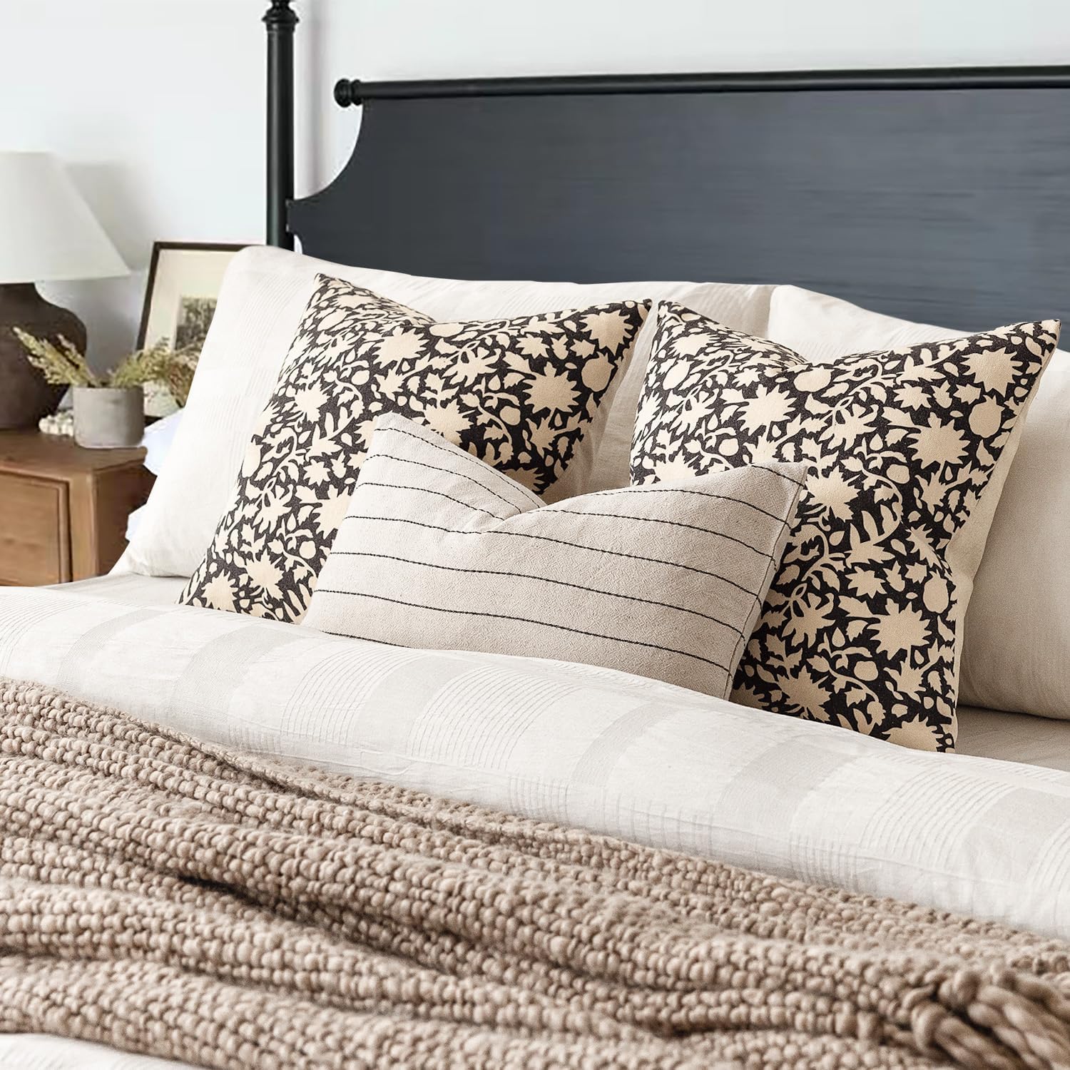 Foindtower Set of 2 Decorative Neutral Floral Throw Pillow Covers Accent Farmhouse Cushion Covers Boho Vintage Pillowcase for Couch Sofa Bedroom Living Room Home Decor Outdoor18×18 Inch,Black